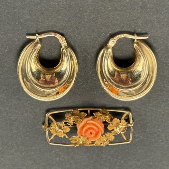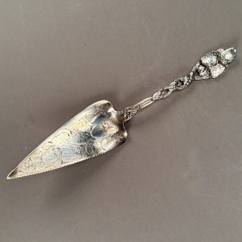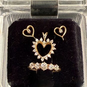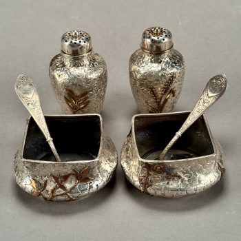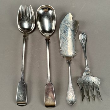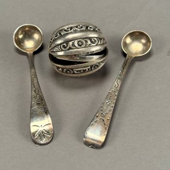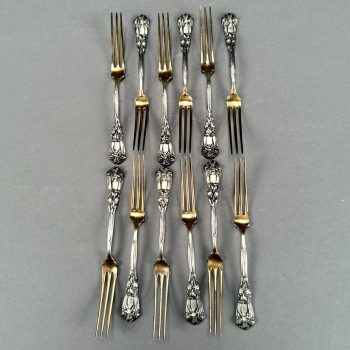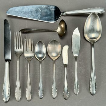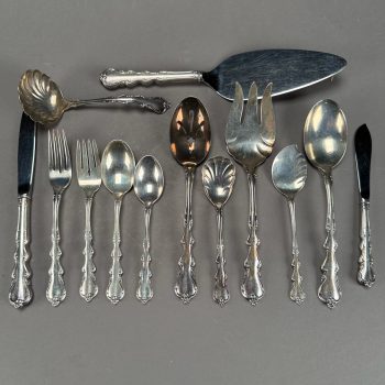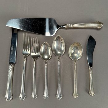 Home / ANTIQUE AUCTION - FRI NOVEMBER 7 AT 6 PM / Page 2 ANTIQUE AUCTION - FRI NOVEMBER 7 AT 6 PM Showing 61–120 of 297 results Default sorting Sort by popularity Sort by latest Sort by price: low to high Sort by price: high to low LOT 058 FOUR PIECE 14K YG AND DIAMOND SUITE, COMPRISED OF PAIR OF HEART SHAPED PIERCED EARRINGS, HEART PENDANT AND 5 DIAMOND RING (SIZE 4-3/4) ALL MARKED 14K, 2.6 DWT LOT 059 18K YG AND STERLING 8 LINK BRACELET 7″ LOT 060 18K YG AND STERLING LARGE RING, SIZE: 6-1/2 LOT 061 10-12K ROSE AND YELLOW GOLD BLACK HILLS GOLD J. CO. NECKLACE 17″(L) 4.3 DWT (6.7 G) LOT 062 10K YG AND LAPIS OVAL RING, SIZE: 5-3/4, 2 DWT (3.2 G) LOT 063 14K YG BLUE STONE RING, SIZE 8-1/4. 1.7 DWT (2.6 G) LOT 064 10K YG DIAMOND AND BLUE STONE RING. SIZE 7-1/2, 2.4 DWT (3.8 G) LOT 065 18K YG DIAMOND AND EMERALD RING SIZE 6-1/2, 1.9 DWT (2.9 G) LOT 065A UNMARKED YG DIAMOND AND WHITE ENAMEL PIN WITH GOLD DOT CLUSTERS. 2″(L) 5.2 DWT (8.2 G) LOT 066 DOUBLE JADE NECKLACE WITH 14K YG CLASP. 18″(L) LOT 067 JADE BEAD NECKLACE. 26″(L) LOT 068 14K YG DIAMOND AND PEARL RING SIZE 2-1/4, 2.1 DWT (3.4 G) LOT 069 THIRTEEN CARVED SEMI-PRECIOUS STONE PENDANTS AND PIECES. INCLUDING JADE, QUARTZ, LAPIS, AMETHYST AND MORE. LARGEST 2 X 2-1/2 LOT 070 14K YG AND OPAL ETERNITY RING SIZE 8-1/4, 6.6 DWT (10.4 G) LOT 071 14K YG AND OPAL PADLOCK SHAPED PENDANT. 1″ X 1/2″. 3.9 DWT (6.1 G) LOT 072 SINGLE STRAND MAJORICA PEARL NECKLACE 32″(L) IN ORIGINAL BOX LOT 073 SINGLE STRAND MAJORICA PEARL NECKLACE 24″(L) IN ORIGINAL BOX LOT 074 DOUBLE STRAND MAJORICA PEARL BRACELET 6″(L) IN ORIGINAL BOX LOT 075 GROUP OF SIX PIECES OF JEWELRY, 18K CAMEO RING (TESTED), SIZE: 6-1/4, 2.2 DWT, HEART SHAPED AMETHYST, PAIR OF AMBER CABOCHON CLIP EARRINGS, OVAL CITRINE PIN AND OVAL AMETHYST PIN LOT 076 PAIR OF PIERCED 14K YG EARRINGS 1.8 DWT (2.8 G) AND 10K YG AND CARVED CORAL PIN. 1-1/4″(L), 1.6 DWT (2.5 G) LOT 077 14K YG NECKLACE WITH 14K YG AND BLACK PEARL PENDANT 16″(L) 4.3 DWT (6.8 G) LOT 078 14K YG BRACELET 7″(L) 4.3 DWT (6.7 G) LOT 079 GOLD, PEARL AND DIAMOND STICKPIN. 2-3/4″(L) LOT 080 14K YG DIAMOND BRACELET WITH 48 DIAMONDS. 8″(L) 6.4 DWT (10 G) LOT 081 14K WG DIAMOND BRACELET. 6-1/2″(L) 6.9 DWT (10.8 G) LOT 082 TEN ASSORTED HAIR COMBS INCLUDING 3 CARVED AND TWO WITH SILVER OVERLAY. LARGEST 7″(L) LOT 083 TWO ENGLISH STERLING ENAMEL DECORATED PINS. 2-3/4″ X 1-3/4″ AND 2-1/4″ X 1-1/2″ LOT 084 UNMARKED SILVER CONCHO BELT. TEN 2″ X 2-1/2″ OVAL CONCHOS. 40″(L) LOT 085 THREE STERLING SILVER PENDANTS WITH STONES AND AN UNMARKED SILVER 8″ BRACELET WITH STONES LOT 086 CALSILICA AND PURPLE STONE BRACELET 6″(L) ALONG WITH A PAIR OF PIERCED EARRINGS LOT 087 TIFFANY STERLING SILVER BRACELET AND TIFFANY STERLING HEART PENDANT LOT 088 TIFFANY STERLING SILVER HEART NECKLACE 24″(L) WITH BOX LOT 089 TIFFANY 7″ STERLING BALL BRACELET AND 20″ STERLING TIFFANY NECKLACE WITH 2 SHAPED HEART PENDANTS WITH A TIFFANY BOX LOT 090 ROLEX “CELLINI” WRISTWATCH, THE BACK MARKED “ROLEX OYSTER PERPETUAL DATE JUSAV 8283021” LOT 091 MOVADO WRISTWATCH WITH BLACK DIAL AND GOLD HANDS LOT 092 NINETY-ONE PC STERLING SILVER FLATWARE SET BY GEORG JENSEN IN THE “BERNADOTTE” PATTERN, IN SILVER BOX, DESIGNED BY BERNADOTTE. DIFFERENT MARKS. 130 OZT (WITHOUT 11 HOLLOW HANDLE PCS) LOT 093 FIFTY-NINE PC STERLING SILVER FLATWARE SET BY TOWLE IN THE “SILVER PLUMES” PATTERN. 58 OZT (WITHOUT 12 KNIVES AND 2 SERVICE PCS) LOT 094 FIFTY PC STERLING SILVER FLATWARE SET BY INTERNATIONAL IN THE “ANGELIQUE” PATTERN. 58 OZT (WITHOUT 8 KNIVES & 2 SERVING PCS) LOT 095 FIFTY-FIVE PC STERLING SILVER FLATWARE SET BY GORHAM IN THE “LYRIC” PATTERN. 53 OZT (WITHOUT 8 KNIVES AND 1 PIE SERVER) LOT 096 FIFTY PC STERLING SILVER FLATWARE SET BY WESTMORELAND IN THE “GEORGE & MARTHA WASHINGTON” PATTERN. 52 OZT (WITHOUT 8 KNIVES) LOT 097 TWO MIXED METAL, STERLING AND COPPER SALT AND PEPPER SETS WITH UNMATCHING SALT SPOONS. DOMINICK AND HAFF, DATED OCT. 3, 1880. COPPER FLOWERS AND LEAF BRANCHES ON STERLING. PEPPERS 2-3/4”(H) OPEN SALTS 1-1/4”(H), 6.4 OZT LOT 098 FOUR LARGE STERLING SILVER FLATWARE SERVING PIECES INCLUDING A 12″ SALAD SET, LONDON. 1859/60 MAKER MARK “EE OVER EJ”. ALSO AN 11″ FISH SERVER AND AN 8″ FORK. 14.8 TR OZ. LOT 099 SET OF 11 ENAMEL DECORATED 4″ SPOONS BY THV. MARTHINSEN, NORWAY AND A SET OF 5 ENAMEL DECORATED 4″ SPOONS BY THE SAME MAKER. 5.1 TR OZ. LOT 100 SIX STERLING SILVER 5″ ICE CREAM SPOONS BY WHITING IN THE “LILY” PATTERN ALONG WITH A 4-1/2″ JELLY SPOON IN THE SAME PATTERN 5.5 TR OZ. LOT 101 TWELVE STERLING SILVER 5″ FORKS BY DURKIN IN THE “IRIS” PATTERN. 5 TR OZ. LOT 102 SET OF 12, 5” STERLING SILVER JULEP CUPS BY FRANK W. SMITH SILVER CO. MARKED ON BASE “G67-2” NO MONOGRAM. 51.6 0ZT LOT 103 SET OF 4 6-3/4” STERLING SILVER GOBLETS BY MANCHESTER SILVER CO. NO MONOGRAM. 18 0ZT LOT 104 STERLING SILVER 5″ GOBLET HAVING EDINBURGH HALLMARKS AS WELL AS OTHERS 4.3 TR OZ. LOT 105 STERLING SILVER FLATWARE SERVING PIECES. 11″ PIE SERVER IN A STRAWBERRY PATTERN 4 TR OZ. LOT 106 SIXTEEN VARIOUS COIN SILVER SPOONS, INCLUDING (3) 9″ J. MOTT, (2) 9″ “I.L.”, (4) 5-1/2 ” “P.O.” AND MORE. 13.8 TR OZ. LOT 107 TWO EARLY ENGLISH MUSTARD SPOONS 4″(L) AND A HINGED NUT FORM NUTMEG GRATER. 1-1/2″(L) LOT 108 THREE PAIR OF STERLING SILVER WEIGHTED CANDLESTICKS, PR 7-3/4″(H) CANDELABRA, PAIR 10″(H) CANDLESTICKS AND A PAIR OF 12-3/4″(H) CANDLESTICKS WITH GLASS SHADES LOT 109 STERLING SILVER OVAL MIRROR BY TIFFANY AND CO. HAVING FOLD OUT BACK STAND. 7-1/2”(H) 6”(W) 3 OZT. LOT 110 SEVEN BOTTLE CASTER SET IN A SILVER-PLATED STAND, CUT CLEAR GLASS PIECES. 9-1/2″(H) LOT 111 H.B. HALL, FRUIT STILL LIFE, OIL ON BOARD, SIGNED AND DATED 1881 BOTTOM RIGHT, FRAMED. 9 X 12 LOT 112 TWO ANTIQUE MOCHAWARE PCS, 9″ PITCHER AND 3-1/2″ MUG WITH BLACK SEAWEED DECORATION ON LIGHT BROWN BACKGROUND LOT 113 LARGE ANTIQUE MOCHAWARE MUG WITH BLACK LINE ZIG ZAG DECORATIO