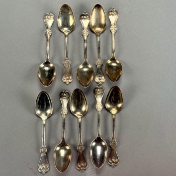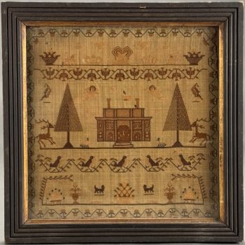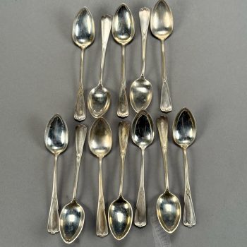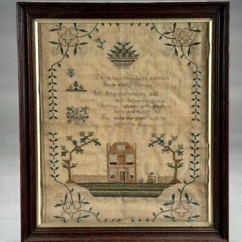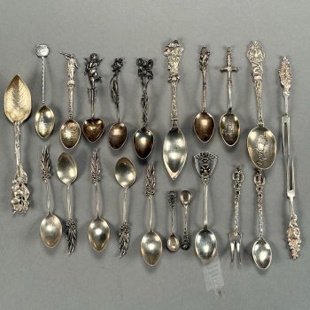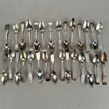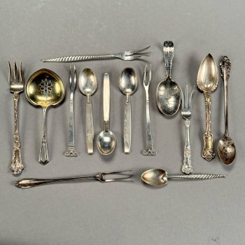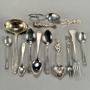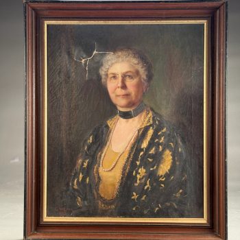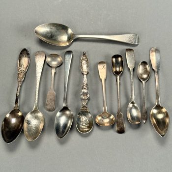 Home / ANTIQUE ESTATE AUCTION - FRI FEBRUARY 20 AT 6 PM / Page 3 ANTIQUE ESTATE AUCTION - FRI FEBRUARY 20 AT 6 PM Showing 121–180 of 300 results Default sorting Sort by popularity Sort by latest Sort by price: low to high Sort by price: high to low LOT 119 TWENTY-TWO PCS OF STERLING SILVER INCLUDING SOUVENIR SPOONS. 6.8 OZT LOT 120 TEN COIN SILVER TEASPOONS DECORATED WITH STRAWBERRIES, PALMER, BACHELDERS & CO. 5-3/4″(L), 6 OZT LOT 121 TWELVE .800 SILVER SPOONS. 5-1/2″(L), 6 OZT LOT 122 TEN PCS OF STERLING SILVER, HOLLOW HANDLED, MOSTLY SERVING PCS LOT 123 NINE FLATWARE PCS, MOSTLY COIN SILVER INCLUDING 6-1/4″ TEASPOON BY THOMAS BYRNES AND ANOTHER BY JOEL SAYRE LOT 124 THIRTEEN PCS OF CONTINENTAL SILVER MARKED .800 OR .830, 10 OZT LOT 125 ELEVEN STERLING SILVER ENGLISH FLATWARE PCS, ASSORTED MAKERS AND DATES. 6.7 OZT LOT 126 TWENTY-NINE COIN SILVER SPOONS BY VARIOUS MAKERS. 15 OZT LOT 127 FOURTEEN STERLING SILVER FLATWARE PCS. 7.3 OZT LOT 128 OVAL MINIATURE PORTRAIT OF GENTLEMAN IN BLACK COAT AND CURLY HAIR WITH SIDEBURNS, HAIR MEMORIAL ON BACK. 2-1/2 X 2 SIGHT SIZE LOT 129 OVAL MINIATURE OF LADY WITH RUFFLED LACE COLLAR, HAIR COMB AND BROWN CURLY HAIR, UNSIGNED, METAL FRAME. 2-3/4 X 2-1/4 LOT 130 OVAL MINIATURE OF GIRL IN WHITE DRESS WITH SKY BACKGROUND, GOLD METAL FRAME WITH HAIR MEMORIAL BACK. 2-1/4 X 2 SIGHT SIZE LOT 131 OVAL MINIATURE PORTRAIT OF YOUNG WOMAN WITH CURLY BROWN HAIR WEARING RED DRESS, SHE HAS A MINIATURE PORTRAIT PINNED TO HER DRESS, BACK HAS A HAIR MEMORIAL, GOLD METAL FRAME. 2-1/4 X 1-3/4 SIGHT SIZE LOT 132 TWO SIDED OVAL MINIATURE PORTRAIT OF TWO BOYS IN METAL FRAME. 1-1/2 X 1-1/4 SIGHT SIZE LOT 133 MINIATURE PORTRAIT PIN OF LADY WITH WHITE HAT AND WHITE RUFFLED COLLAR. 1-1/4 X 3/4 SIGHT SIZE LOT 134 OVAL MINIATURE PORTRAIT OF WOMAN (MRS JOHN WRIGHT) HOUSED IN RED LEATHER HINGED CASE. 2-1/4 X 1-3/4 SIGHT SIZE LOT 135 CHIPPENDALE CHERRY SLANT FRONT DESK WITH GRADUATED DRAWERS, BRACKET BASE AND DOVETAILED CONSTRUCTION. 45″(H), 40″(W), 19″(D) LOT 136 ANTIQUE BIRDSEYE MAPLE TEA CADDY. 5″(H), 9″(W), 5″(D) LOT 137 CHILDS SIZE RABBIT EAR WINDSOR SIDE CHAIR IN OLD FINISH, 30″(H) LOT 138 MAX ERNST, “MASQUES”, LITHOGRAPH IN COLORS ON ARCHES WOVE PAPER, SIGNED IN PENCIL LOWER LEFT AND NUMBERED 50/200 LOWER RIGHT, UNFRAMED. 15 X 22-1/4 LOT 139 RICHARD IRVING BOWMAN, ABSTRACT HEAD, WATERCOLOR ON PAPER, SIGNED LOWER LEFT AND DATED 44, UNFRAMED. 10-1/4 X 7-1/2 LOT 140 SIGNED, “VIDVA #1”, MARKER & OIL, SIGNED INDISTINCTLY ON REVERSE, UNFRAMED. 29-1/4 X 22 LOT 141 JULIO DE DIEGO, FIGURAL ABSTRACTION, PENCIL, COLORED PENCIL ON LIGHT BOARD, SIGNED IN PENCIL LOWER RIGHT AND DATED 46, UNFRAMED. 10 X 18 LOT 142 WONDERFUL DOUBLE PORTRAIT OF MOTHER WEARING GREEN DRESS, SEATED, AND YOUNG DAUGHTER WEARING BLUE DRESS HOLDING A BIRD, SIGNED ON EDGE OF TABLE “A.H. WING 1841”, LEMON GOLD FRAME. 5-1/4 X 6-1/2 LOT 143 FRAMED OVAL MINIATURE PORTRAIT OF A WOMAN WITH LACE BONNET AND RED SHAWL AND BLUE DRESS, UNSIGNED. 2-1/2 X 2 SIGHT SIZE LOT 144 FRAMED MINIATURE OF GIRL WITH BROWN HAIR AND WEARING A CORAL NECKLACE WRITTEN ON REVERSE “AGED 13, 1819”, 2-1/2 X 2 SIGHT SIZE LOT 145 FRAMED MINIATURE PORTRAIT OF YOUNG LADY WITH BLUE PRINT DRESS WEARING BEAD NECKLACE AND GOLD EARRING. 2-3/4 X 2-1/4 SIGHT SIZE LOT 146 FRAMED MINIATURE OVAL MEMORIAL “TO BLISS – NOT LOST BUT GONE FOREVER” WRITTEN ON MEMORIAL STONE WITH 3 GRIEVING FAMILY MEMBERS. 2-3/4 X 2-1/4 SIGHT SIZE LOT 147 FRAMED 19TH C. NEEDLEWORK SAMPLER BY ANNA GRIN, WITH LARGE HOUSE WITH MAN AND WOMAN, ANIMALS, FLOWERS, TREES AND MORE. 12 X 12 SIGHT SIZE LOT 148 FRAMED 19TH C. NEEDLEWORK SAMPLER BY CAROLINE ROBINS AGED 8 YEARS, 1822, HAVING HOUSE FLANKED BY TREES AND ANIMALS. 12-1/2 X 12-1/2 SIGHT SIZE LOT 149 FRAMED 19TH C. NEEDLEWORK SAMPLER WITH ANIMALS, TREES, HOUSE AND VERSE “SHE SHALL BE BROUGHT UNTO THE KING IN ROBES OF NEEDLEWORK”, 15 X 11-1/2 SIGHT SIZE LOT 150 FRAMED 19TH C. NEEDLEWORK SAMPLER BY EMMA SEWARD, 1838 DEPICTING ST. PAULS CATHEDRAL, LONDON, TREES, ANGELS, BIRDS, BASKET OF FRUIT AND MORE. 16 X 12 SIGHT SIZE LOT 151 TWO PART HEPPLEWHITE DESK WITH FOLD OVER WRITING SURFACE, 1 DOOR TOP SECTION WITH SHELVES BEHIND. 69-1/2″(H), 36″(W), 21″(D) LOT 152 FRAMED PORTRAIT OF A MAN WITH BLACK COAT AND GREEN PATTERNED VEST, BIRDSEYE MAPLE FRAME, UNSIGNED. 18 X 14 LOT 153 ROBERT W. MALLARY, BLUE & BROWN ABSTRACT PRINT, SIGNED IN PENCIL LOWER RIGHT, ARTISTS PROOF, UNFRAMED. 20 X 25 LOT 154 GEORGE COHEN, ZIG ZAG LINED ABSTRACT, COLORED MARKER PEN ON BROWN PAPER, SIGNED AND DATED 1979 ON REVERSE, UNFRAMED. 12-1/2 X 9-1/2 LOT 155 GEORGE COHEN, ANGLED LINE ABSTRACT, COLORED MARKER, SIGNED ON REVERSE, DATED 1980, UNFRAMED. 28-3/4 X 23 LOT 156 GEORGE COHEN, MOBIUS STRIP LINE ABSTRACT, COLORED MARKER PEN, SIGNED LOWER RIGHT AND ON REVERSE, DATED 1979, UNFRAMED. 19 X 25 LOT 157 LOUIS VUITTON BROWN TOTE BAG. S/N AB0066, 8 X 9″ LOT 158 LOUIS VUITTON CROSS BODY BAG. S/N BL7056, 5″ X 10″ LOT 159 LOUIS VUITTON WALLET, 4″ X 6″ LOT 160 CHANEL BLACK QUILTED LAMBSKIN DOUBLE FLAP BAG WITH DOUBLE LEATHER AND GOLD CHAIN STRAP, BURGUNDY LEATHER INTERIOR. 6″ X 10″ LOT 161 PRADA BLACK NYLON SHOULDER BAG. 10″ X 11″ LOT 162 PRADA BLACK LEATHER HANDBAG (AS IS) 5″ X 10-1/2″ LOT 163 KATE SPADE BLACK HANDBAG. 8″ X 11″ LOT 164 COACH BLACK LEATHER HANDBAG, USA NO. 0379-008. 6″ X 10″ LOT 165 KATE SPADE HANDBAG, BLACK & SILVER DESIGN. 5″ X 10-1/2″ LOT 166 COACH BROWN LEATHER HANDBAG, USA NO. 052-1006. 8″ X 11″ LOT 167 LARGE MURANO ART GLASS FISH CENTERPIECE IN 2 PARTS, THE 2 BLUE FISH HAVING RED INTERIOR WHICH MATCH THE RED HIGHLIGHTED IN THE SEPARATE SHALLOW BOWL BASE, UNSIGNED. 16-1/2″(D), 21-1/2″(H) LOT 168 VICTORIAN CARVED SOFA. 38″(H), 62″(L) LOT 169 GRACE WOODBRIDGE GEER, PORTRAIT OF A LADY WEARING KIMONO AND PEARLS. SIGNED LOWER LEFT AND DATED 1928, OIL ON CANVAS (X-SHAPED TEAR) FRAMED 27 X 22 LOT 170 TOM GRAFFAGNINO, “GROWTH PATTERN I” 1976, PEN & INK, SIGNED ON REVER