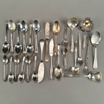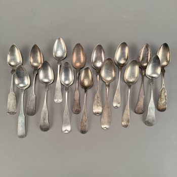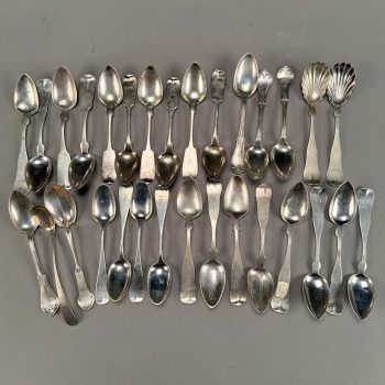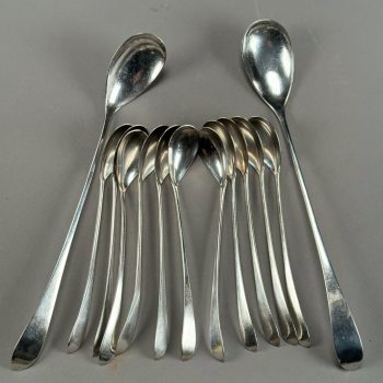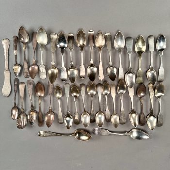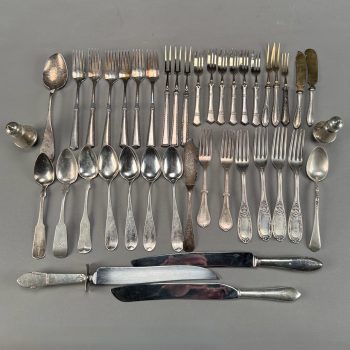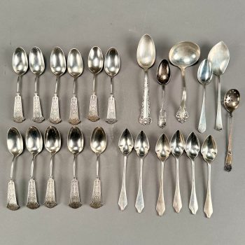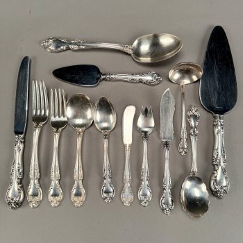Home / ANTIQUE ESTATE AUCTION - FRI MARCH 27 AT 6 PM / Page 2 ANTIQUE ESTATE AUCTION - FRI MARCH 27 AT 6 PM Showing 61–120 of 344 results Default sorting Sort by popularity Sort by latest Sort by price: low to high Sort by price: high to low LOT 061 SILVER & TURQUOISE BOLO SLIDE HAVING A BUFFALO NICKEL, BUFFALO HEAD AND TURQUOISE CHUNK. 2-3/4 X 2″ LOT 062 SILVER & MARCASITE DRAGON PIN. 2-1/2″(L), 1-1/2″(H) LOT 063 CHARM BRACELET HAVING 21 CHARMS (SOME STERLING) LOT 064 FOUR MORGAN SILVER DOLLARS, 1879, 1880, 1881, 1887o LOT 065 PAIR OF TIFFANY & CO. STERLING SILVER CANDLESTICKS MARKED “TIFFANY & CO. STERLING DENMARK”. 6-1/2″(H), 25.4 OZT LOT 066 TIFFANY & CO. COIN SILVER SERVING SPOON ALSO MARKED HH&CO. PATENT 1853. ORIENTAL PATTERN 12-1/2”(L) 4.8 OZT LOT 067 ANTIQUE RUSSIAN NIELLO HINGED BOX BY VIKTOR SAVINKOV, MOSCOW 1884. THE TOP DECORATED WITH A BUILDING, INTERIOR FULLY HALLMARKED LOT 068 STERLING TOP CLEAR GLASS PERFUME. 5″(H), ENGLISH HALLMARKS LOT 069 STERLING SILVER SWING HANDLE RETICULATED BASKET. 7-1/2″(W) X 5-1/2″(D), 4″(H), 5.3 OZT LOT 070 THIRTEEN PIECES OF ARTHUR J. STONE STERLING SILVER INCLUDING TWO 12″ STIRRING SPOONS BY EDWARD BILLINGS AND ELEVEN 7-3/4″ SPOONS BY GEORGE C. ERICKSON. 15.4 OZT LOT 071 ARTHUR J. STONE STERLING SILVER PITCHER BY MAGNUS CARLBERG. 4″(H), 9.6 OZT LOT 072 ENGLISH STERLING SILVER CHAMBERSTICK BY THE ALEX CLARK MANUFACTURING CO. LONDON, 1901 WITH SNUFFER AND BOBECHE, 3″(H), 7″(L), 8 OZT LOT 073 TOWLE STERLING SILVER SUGAR AND CREAMER. 5.5 OZT LOT 074 SIXTY-ONE PC STERLING FLATWARE SET BY GORHAM IN THE “MELROSE PATTERN, SERVICE FOR 8, WITH BOX. 73 OZT LOT 075 THIRTY-SEVEN PCS OF COIN SILVER FLATWARE. 19.3 OZT LOT 076 FORTY-ONE PCS OF SILVER INCLUDING 16 PCS OF COIN SILVER (18 OZT) AND 25 PCS OF WEIGHTED HOLLOW HANDLED FLATWARE PIECES LOT 077 TWENTY-THREE PCS OF STERLING SILVER FLATWARE, SOME OF WHICH IS ENGLISH. 19.9 OZT LOT 078 TWENTY-SIX PCS OF STERLING SILVER FLATWARE INCLUDING SOME SMALL SERVING PIECES. 15.7 OZT LOT 079 THIRTY PCS OF COIN SILVER FLATWARE. 17.6 OZT LOT 080 FIFTEEN COIN SILVER TABLESPOONS. 20.3 OZT LOT 081 GEORG JENSEN STERLING SILVER TEA STRAINER IN THE ACORN PATTERN 5”(L), 1.2 OZT LOT 082 GEORG JENSEN STERLING SILVER PIE SERVER IN THE ACORN PATTERN 10-1/2” (L) 4 OZT LOT 083 GEORG JENSEN SET OF 8, 4-1/2”(L) STERLING SILVER SPOONS IN THE ACORN PATTERN. 4 OZT LOT 084 GEORG JENSEN STERLING SILVER CARVING SET IN THE ACORN PATTERN, 12-1/2” KNIFE, 10-1/2” FORK LOT 085 THREE PIECES OF GEORG JENSEN STERLING SILVER 10-1/4” KNIFE, 8” FORK, 11” KNIFE, ALL IN THE ACORN PATTERN LOT 086 STERLING FOOTED BOWL, WEIGHTED. 5″(H), 9″(D) LOT 087 TWO JOSH SIMPSON SPHERES, 1 WITH BEVELED BOTTOM SIGNED, THE OTHER ROUND WITH SIGNATURE. 1-3/4″(D) LOT 088 TWO JOSH SIMPSON GLASS SPHERE PLANETS ON LUCITE STANDS. 1-3/4″(D) LOT 089 CHIPPENDALE 9-DRAWER TALL CHEST, 3 OVER 2 OVER 4 GRADUATED DRAWERS ON BRACKET BASE. 64″(H), 37″(W), 19-1/2″(D) LOT 090 ANTIQUE MAHOGANY BANJO CLOCK, TIME ONLY, PENDULUM AND WEIGHT PRESENT. 32-1/2″(H) LOT 091 INLAID MAHOGANY HEPPLEWHITE MARTHA WASHINGTON SEWING STAND WITH 3 DRAWERS AND 2 HINGED LID COMPARTMENTS. 29″(H), 28″(W), 13-1/4″(D) LOT 092 AFTER JOHN JAMES AUDUBON, “CAROLINA PARROT”, PLATE 278, CHROMOLITHOGRAPH, J. BIEN EDITION 1860 NEW YORK, FRAMED. 35-3/4 X 24 SIGHT SIZE, NOT EXAMINED OUT OF FRAME LOT 093 DIMINUTIVE CHIPPENDALE BUTLER’S CHEST WITH SLIDE HAVING 2 OVER 3 DRAWERS, APPLIED MOLDED TOP AND BRACKET BASE. 29-1/4″(H), 29-1/2″(W), 16″(D) LOT 094 QUEEN ANNE MAHOGANY 2-PART HIGHBOY, TOP SECTION WITH 8 DRAWERS, BOTTOM WITH 2 DRAWERS, 65″(H), TOP CASE 37″(W), 20″(D), BOTTOM 39″(W), 21″(D) LOT 095 INLAID ROUND TOP QUEEN ANNE STYLE CANDLESTAND. 20-3/4″(H) X 16″(D) LOT 096 ROBERT BLISS, AFTERNOON REST, OIL ON MASONITE, SIGNED AND DATED BOTTOM RIGHT, FRAMED. 22 X 36 LOT 097 REPRODUCTION PRESENTATION BANJO CLOCK BY FOSTER S. CAMPOS, PEMBROKE, MA, WITH MT. VERNON GLASS, PENDULUM & WEIGHT PRESENT. 38-1/2″(H) LOT 098 QUEEN ANNE SWING LEG HALF ROUND CARD OR CENTER TABLE. 27″(H), 32″(W), 15″(D) LOT 099 HEPPLEWHITE 1-DRAWER STAND. 29″(H), 20″(W), 16-1/4″(D) LOT 100 SET OF 4 ANTIQUE STEP DOWN WINDSOR SIDE CHAIRS. 36″(H) LOT 101 ANTIQUE MAHOGANY BANJO CLOCK, TIME ONLY, PENDULUM AND WEIGHT PRESENT. 29″(H) LOT 102 CHIPPENDALE ARMCHAIR WITH SLIP SEAT 39”(H) LOT 103 ANTIQUE SET OF BALUSTER PEWTER MEASURES. 2-1/4″(H) – 6-1/4″(H) LOT 104 SIX ANTIQUE PEWTER PLATES. 14-3/4 -7-1/2″(D) LOT 105 EIGHT PCS OF ANTIQUE PEWTER INCLUDING PAIR 4″ CANDLESTICKS LOT 106 BRACKET BASE BLANKET CHEST WITH DOVETAIL CONSTRUCTION. 18″(H), 37-3/4″(W), 15″(D) LOT 107 JESS EVERETT SLATER, AUTUMN IN NEW ENGLAND, OIL ON CANVAS BOARD, SIGNED LOWER LEFT, FRAMED. 18 X 24 LOT 108 ASSEMBLED SET OF 4 ANTIQUE STEP DOWN WINDSOR SIDE CHAIRS. 34″(H) LOT 109 BRACKET BASE BLANKET CHEST WITH DOVETAIL CONSTRUCTION AND TILL. 20″(H), 37-1/4″(W), 17-1/2″(D) LOT 110 ANTIQUE MAHOGANY WASHSTAND HAVING 1 DRAWER, 1 DOOR AND GALLERY TOP. 38″(H), 20″(W), 15″(D) LOT 111 UNSIGNED B.G. HIGGINS, CHESTERFIELD, MA RECTANGULAR FIXED HANDLE BASKET ALONG WITH THE BASKET SHOP HAT. 7-3/4″(H) W/O HANDLE, 20-1/2 X 13-1/2 LOT 112 UNSIGNED B.G. HIGGINS, CHESTERFIELD, MA RECTANGULAR FIXED HANDLE BASKET. 12-1/2″(H) W/O HANDLE, 8-1/2 X 15 LOT 113 UNSIGNED B.G. HIGGINS, CHESTERFIELD, MA BASKET WITH FIXED HANDLE. 5-1/4″(H) W/O HANDLE, 12″(D) LOT 114 UNSIGNED B.G. HIGGINS, CHESTERFIELD, MA RECTANGULAR FIXED HANDLE BASKET, 7-1/2″(H) W/O HANDLE, 20-1/2 X 13-3/4 LOT 115 UNSIGNED B.G. HIGGINS, CHESTERFIELD, MA FIXED HANDLE BASKET. 5″(H), 11-1/2″(D) LOT 116 UNSIGNED B.G. HIGGINS, CHESTERFIELD, MA RECTANGULAR DOUBLE SWING HANDLED BASKET. 14″(H), 18 X 9 LOT 117 UNSIGNED B.G. HIGGINS, CHESTERFIELD, MA BASKET WITH SWING HANDLE. 11″(H), 14-1/4″(D) LOT 118 UNSIGNED B.G. HIGGINS, CHESTERFIELD, MA BASKET WITH SWING HANDLE. 8″(H), 11-1/2″(D) LOT 119 TW