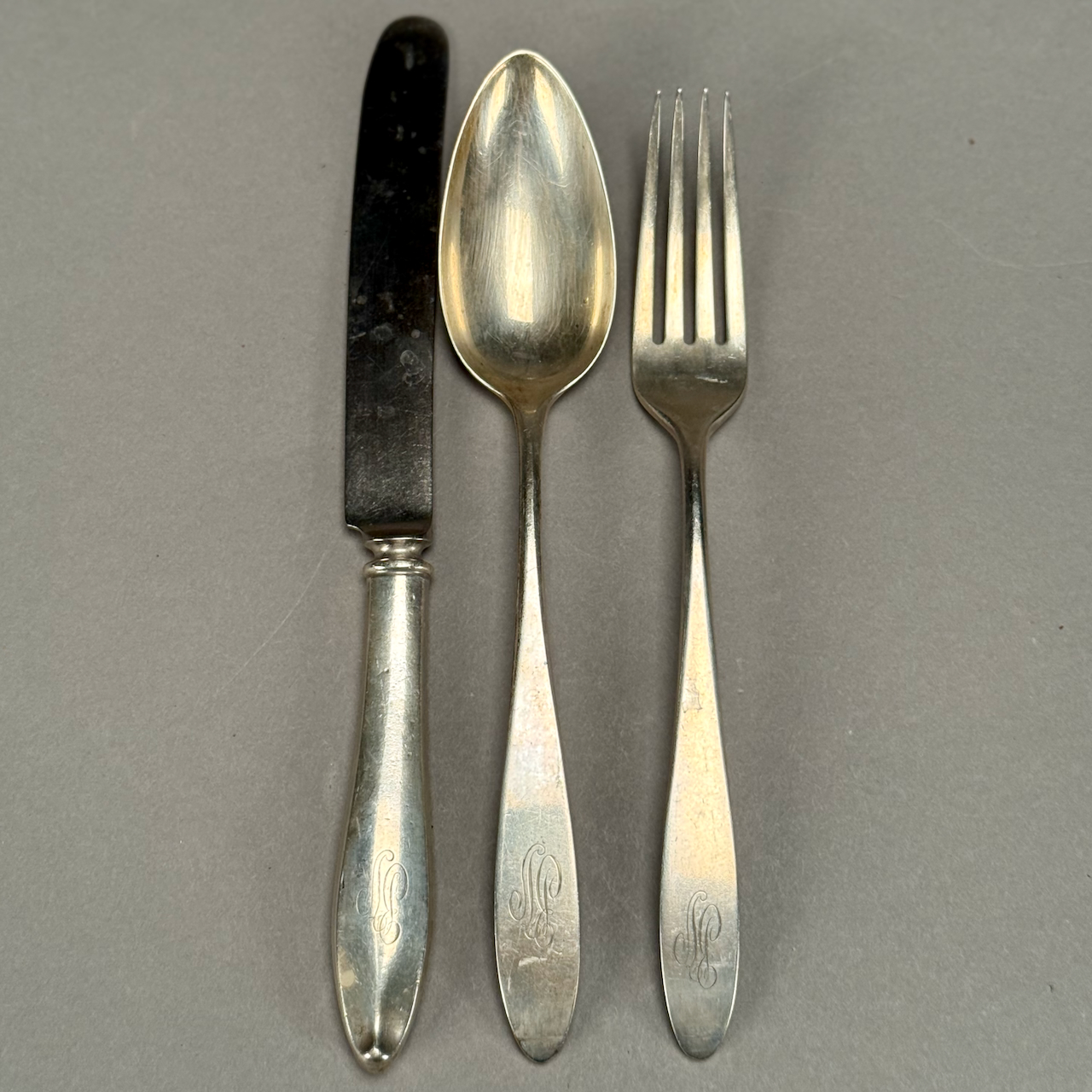 Home / ANTIQUE AUCTION - FRI OCTOBER 3 AT 6 PM / LOT 002 THIRTY-THREE PC STERLING SILVER FLATWARE SET BY REED & BARTON IN THE “FRENCH ANTIQUE” PATTERN. 32.3 OZT (EXCLUDING 16 KNIVES) LOT 002 THIRTY-THREE PC STERLING SILVER FLATWARE SET BY REED & BARTON IN THE “FRENCH ANTIQUE” PATTERN. 32.3 OZT (EXCLUDING 16 KNIVES) Place a Bid Categories: ANTIQUE AUCTION - FRI OCTOBER 3 AT 6 PM, OCTOBER 3 AT 6 PM Tag: auction Related products LOT 022 STEPHEN G. MANIATTY, ‘BUCKET OF POSIES’, OIL ON CANVAS, SIGNED LOWER RIGHT, FRAMED. 38 X 36 LOT 021 OSCAR BERNINGHAUS, ‘THE ROAD TO TAOS’, OIL ON CANVAS, SIGNED LOWER RIGHT, GILT FRAME WITH ARTIST PLAQUE. ON REVERSE OF FRAME IS A PENNSYLVANIA ACADEMY OF THE FINE ART LABEL FOR THEIR 109TH ANNUAL ART EXHIBITION WITH TITLE AND ARTIST (1914). 24 X 36 LOT 011 4 PCS OF ENGLISH STERLING SILVER. (1) EXPANDING TOAST RACK, 1901-1902, LONDON, 3″(H). (2) 3″ TEA CADDY SPOON, 1796-7, LONDON. (3) 7″ RETICULATED 2 HANDLED DISH, 1906-7, BIRMINGHAM. (4) 2″(H) TANKARD SHAPED MUSTARD WITH COBALT LINER, 1902-3, BIRMINGHAM. 12.6 OZT (W/O LINER) LOT 017 CONTINENTAL SILVER (.800) DRESSER BOX MARKED ON BASE ‘BEUTHNER’. 3-1/4″(H), 5-1/2″(W) X 4″(D), 8 OZT