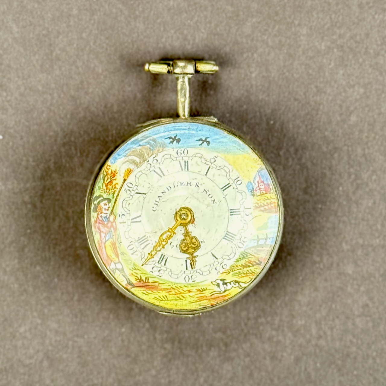 Home / ANTIQUE ESTATE AUCTION - FRI FEBRUARY 20 AT 6 PM / LOT 003 CHANDLER & SON, LONDON, SILVER CASED POCKET WATCH HAVING FUSEE MOVEMENT, SIGNED DIAL & MOVEMENT, THE DIAL HAVING A SCENE OF DUCK HUNTERS, MOVEMENT #540 LOT 003 CHANDLER & SON, LONDON, SILVER CASED POCKET WATCH HAVING FUSEE MOVEMENT, SIGNED DIAL & MOVEMENT, THE DIAL HAVING A SCENE OF DUCK HUNTERS, MOVEMENT #540 Place a Bid Category: ANTIQUE ESTATE AUCTION - FRI FEBRUARY 20 AT 6 PM Tag: auction Related products LOT 008 11 STERLING SILVER PLATES BY GORHAM. 6″(D), 27.8 OZT LOT 010 2 STERLING SILVER SHAKERS, ONE 6″(H) WITH BLURRED ENGLISH HALLMARKS, THE OTHER 6-1/2″(H) MARKED STERLING. 9 OZT LOT 009 48 PC STERLING SILVER FLATWARE SET IN THE “KING GEORGE” PATTERN BY GORHAM, 57 OZT (WITHOUT 16 KNIVES) MONOGRAMMED LOT 012 2 SMALL STERLING SILVER TRAYS. (1) 6″ SQUARE BY DOMINICK & HAFF (2) 7-1/2 X 5-1/2 OVAL FOOTED TRAY BY J.E. CALDWELL & CO, BOTH MONOGRAMMED. 11.7 OZT