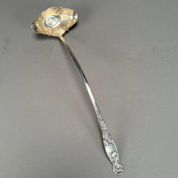 Home / OCTOBER 3 AT 6 PM / LOT 005 STERLING SILVER PUNCH LADLE BY WHITING IN THE “HERALDIC” PATTERN. 4.6 OZT, 14-1/2″(L) LOT 005 STERLING SILVER PUNCH LADLE BY WHITING IN THE “HERALDIC” PATTERN. 4.6 OZT, 14-1/2″(L) Place a Bid Categories: ANTIQUE AUCTION - FRI OCTOBER 3 AT 6 PM, OCTOBER 3 AT 6 PM Tag: auction Related products LOT 003 PAIR OF STERLING SILVER PORRINGERS BY GEBELEIN, BOSTON. 7″(L), 4-3/4 BOWL, 12 OZT LOT 008 11 STERLING SILVER PLATES BY GORHAM. 6″(D), 27.8 OZT LOT 011 4 PCS OF ENGLISH STERLING SILVER. (1) EXPANDING TOAST RACK, 1901-1902, LONDON, 3″(H). (2) 3″ TEA CADDY SPOON, 1796-7, LONDON. (3) 7″ RETICULATED 2 HANDLED DISH, 1906-7, BIRMINGHAM. (4) 2″(H) TANKARD SHAPED MUSTARD WITH COBALT LINER, 1902-3, BIRMINGHAM. 12.6 OZT (W/O LINER) LOT 013 3 PCS OF STERLING SILVER: (1) OVAL DEEP SERVING DISH BY E. CALDWELL & CO, 10 X 6-1/2. (2) PORRINGER BY DOMINICK & HAFF, 7″. (3) PORRINGER BY RWM, 6″. 21.8 OZT