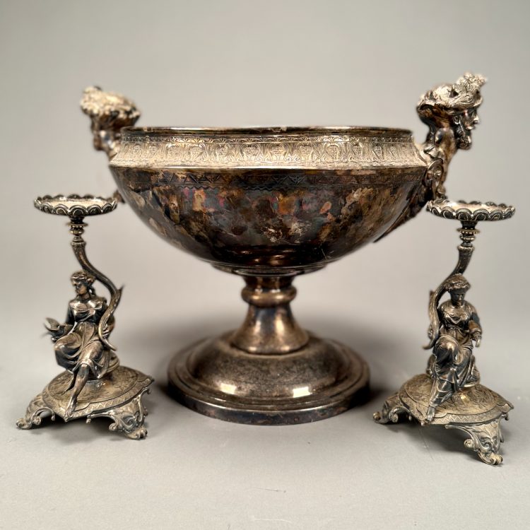 Home / ANTIQUE AUCTION - FRI OCTOBER 3 AT 6 PM / LOT 007 LARGE MERIDEN & CO ANTIQUE SILVER PLATED PEDESTAL CENTER BOWL HAVING LARGE FIGURAL HEAD HANDLES, 14″(H), 13″(D), ALONG WITH A PAIR OF FIGURAL COMPOTE BASES IN SILVER PLATE. 9-1/4″(H) LOT 007 LARGE MERIDEN & CO ANTIQUE SILVER PLATED PEDESTAL CENTER BOWL HAVING LARGE FIGURAL HEAD HANDLES, 14″(H), 13″(D), ALONG WITH A PAIR OF FIGURAL COMPOTE BASES IN SILVER PLATE. 9-1/4″(H) Place a Bid Categories: ANTIQUE AUCTION - FRI OCTOBER 3 AT 6 PM, OCTOBER 3 AT 6 PM Tag: auction Related products LOT 008 11 STERLING SILVER PLATES BY GORHAM. 6″(D), 27.8 OZT LOT 012 2 SMALL STERLING SILVER TRAYS. (1) 6″ SQUARE BY DOMINICK & HAFF (2) 7-1/2 X 5-1/2 OVAL FOOTED TRAY BY J.E. CALDWELL & CO, BOTH MONOGRAMMED. 11.7 OZT LOT 004 133 PC STERLING SILVER FLATWARE SET IN THE “KING PATTERN. 190 OZT (EXCLUDING 12 KNIVES), MONOGRAMMED LOT 003 PAIR OF STERLING SILVER PORRINGERS BY GEBELEIN, BOSTON. 7″(L), 4-3/4 BOWL, 12 OZT
