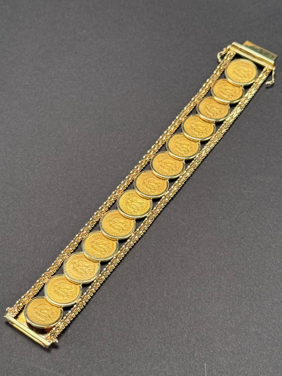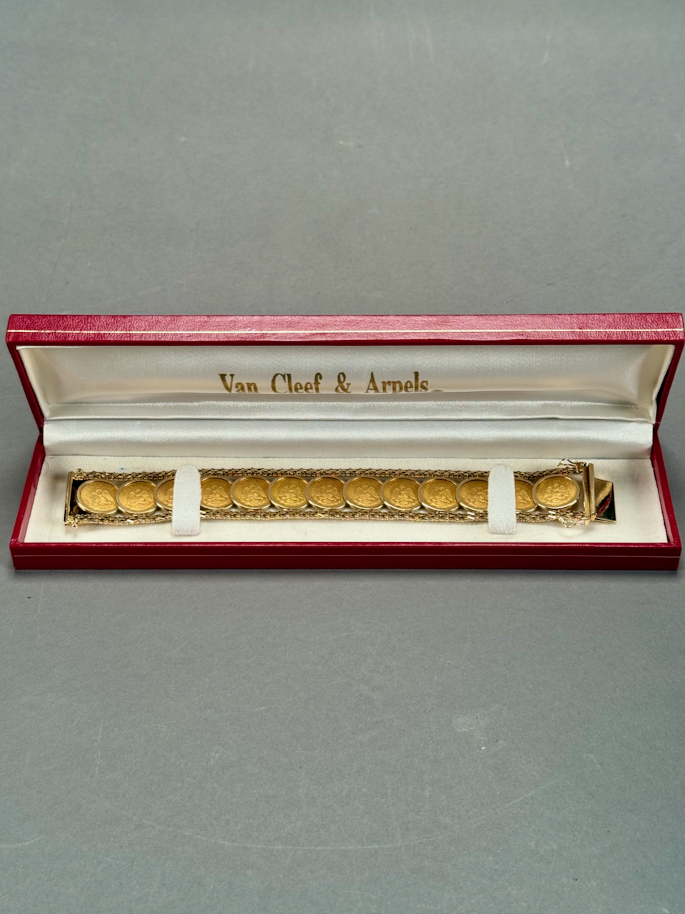 Home / ANTIQUE AUCTION - FRI NOVEMBER 7 AT 6 PM / LOT 008 VAN CLEEF & ARPELS 14K YG BRACELET WITH 13 1945 MEXICAN GOLD 2-1/2 PESO COINS 7-1/4 “(L) 34.3 DWT (53.3 G OR 1.88 OZT) LOT 008 VAN CLEEF & ARPELS 14K YG BRACELET WITH 13 1945 MEXICAN GOLD 2-1/2 PESO COINS 7-1/4 “(L) 34.3 DWT (53.3 G OR 1.88 OZT) Place a Bid Category: ANTIQUE AUCTION - FRI NOVEMBER 7 AT 6 PM Tag: auction Related products LOT 008 11 STERLING SILVER PLATES BY GORHAM. 6″(D), 27.8 OZT LOT 004 133 PC STERLING SILVER FLATWARE SET IN THE “KING PATTERN. 190 OZT (EXCLUDING 12 KNIVES), MONOGRAMMED LOT 024 STEPHEN G. MANIATTY, ‘OCTOBERS GIFT’, OIL ON CANVAS, SIGNED LOWER RIGHT, FRAMED. 34 X 25 LOT 005 PAIR OF STERLING SILVER CANDELABRAS BY ARROWSMITH, WEIGHTED IN 2 PARTS. 14-1/2″(H) (1 REPAIRED)