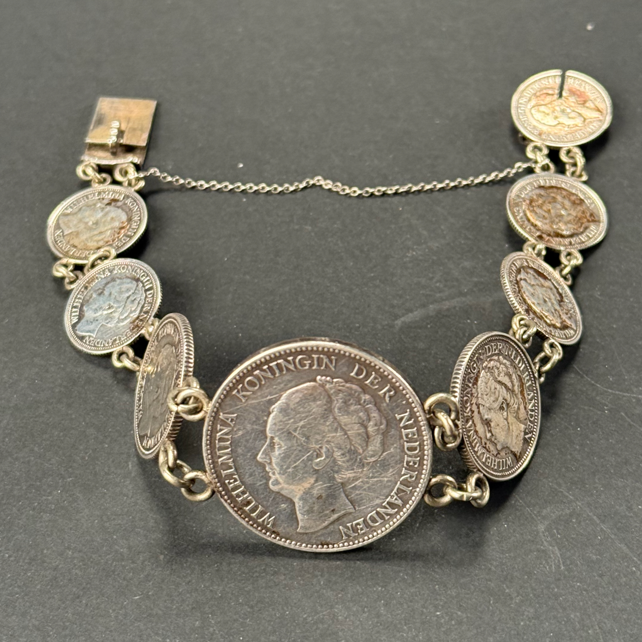 Home / ANTIQUE ESTATE AUCTION - FRI DECEMBER 12 AT 6 PM / LOT 012 EIGHT COIN BRACELET, 1931-1941 DUTCH COINS LOT 012 EIGHT COIN BRACELET, 1931-1941 DUTCH COINS Place a Bid Category: ANTIQUE ESTATE AUCTION - FRI DECEMBER 12 AT 6 PM Tag: auction Related products LOT 008 11 STERLING SILVER PLATES BY GORHAM. 6″(D), 27.8 OZT LOT 020 STERLING SILVER HINGED SQUARE BOX, LONDON, 1806, MAKERS MARK RH?, THE LID WITH A REPOUSSE SCENE OF 2 MEN PLAYING A BOARD GAME. 1-1/4″(H), 4″(W), 4″(D) LOT 003 PAIR OF STERLING SILVER PORRINGERS BY GEBELEIN, BOSTON. 7″(L), 4-3/4 BOWL, 12 OZT LOT 013 3 PCS OF STERLING SILVER: (1) OVAL DEEP SERVING DISH BY E. CALDWELL & CO, 10 X 6-1/2. (2) PORRINGER BY DOMINICK & HAFF, 7″. (3) PORRINGER BY RWM, 6″. 21.8 OZT