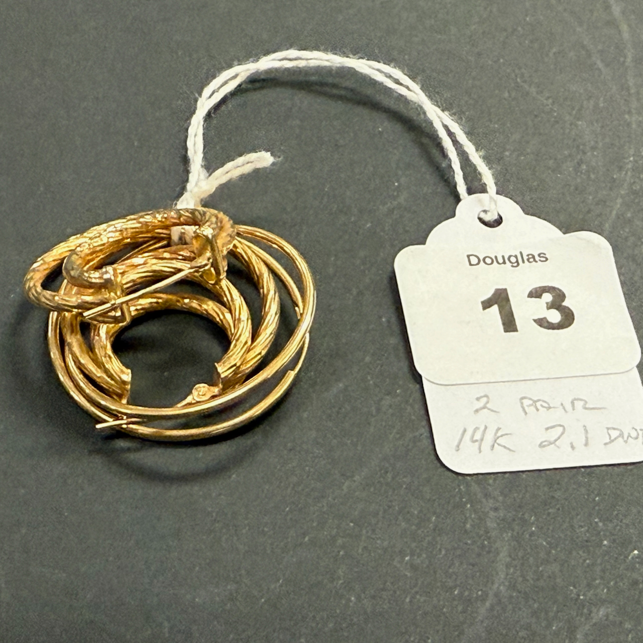 Home / LARGE ESTATE AUCTION - FRI JANUARY 16 AT 6 PM / LOT 013 TWO PAIR 14K EARRINGS, 2.1 DWT LOT 013 TWO PAIR 14K EARRINGS, 2.1 DWT Place a Bid Category: LARGE ESTATE AUCTION - FRI JANUARY 16 AT 6 PM Tag: auction Related products LOT 018 COIN SILVER HANDLED CUP, PROBABLY FREEMAN & WALLIN, PHILADELPHIA, CIRCA 1850. 4″(H), 3.6 OZT. LOT 016 6 PCS OF STERLING SILVER: (1) 6″(D) PLATE BY TOWLE. (2) 3-1/2 FOOTED CREAMER BY POOLE. (3) 4″(D) FOOTED BOWL BY SHREVE, CRUMP & LOW CO (4) 7″(L) FOOTED GRAVY BY J.E. CALDWELL & CO (5) 4″ CREAMER BY DOMINICK & HAFF (6) 6-3/4″(W) DISH BY TOWLE. 25.2 OZT LOT 013 3 PCS OF STERLING SILVER: (1) OVAL DEEP SERVING DISH BY E. CALDWELL & CO, 10 X 6-1/2. (2) PORRINGER BY DOMINICK & HAFF, 7″. (3) PORRINGER BY RWM, 6″. 21.8 OZT LOT 011 4 PCS OF ENGLISH STERLING SILVER. (1) EXPANDING TOAST RACK, 1901-1902, LONDON, 3″(H). (2) 3″ TEA CADDY SPOON, 1796-7, LONDON. (3) 7″ RETICULATED 2 HANDLED DISH, 1906-7, BIRMINGHAM. (4) 2″(H) TANKARD SHAPED MUSTARD WITH COBALT LINER, 1902-3, BIRMINGHAM. 12.6 OZT (W/O LINER)