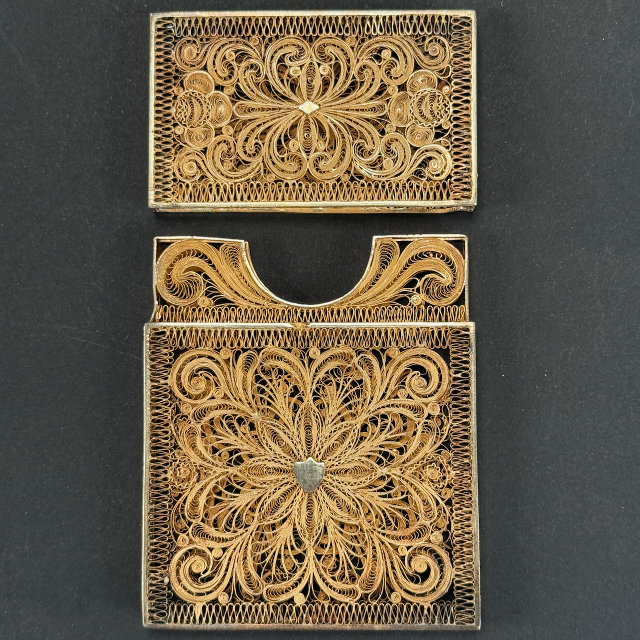 Home / ANTIQUE AUCTION - FRI NOVEMBER 7 AT 6 PM / LOT 014 FINE GOLD FILIGREE CARD CASE WITH HALLMARK. 4″ X 2-1/2″ 39.7 DWT (61.7 G) LOT 014 FINE GOLD FILIGREE CARD CASE WITH HALLMARK. 4″ X 2-1/2″ 39.7 DWT (61.7 G) Place a Bid Category: ANTIQUE AUCTION - FRI NOVEMBER 7 AT 6 PM Tag: auction Related products LOT 013 3 PCS OF STERLING SILVER: (1) OVAL DEEP SERVING DISH BY E. CALDWELL & CO, 10 X 6-1/2. (2) PORRINGER BY DOMINICK & HAFF, 7″. (3) PORRINGER BY RWM, 6″. 21.8 OZT LOT 016 6 PCS OF STERLING SILVER: (1) 6″(D) PLATE BY TOWLE. (2) 3-1/2 FOOTED CREAMER BY POOLE. (3) 4″(D) FOOTED BOWL BY SHREVE, CRUMP & LOW CO (4) 7″(L) FOOTED GRAVY BY J.E. CALDWELL & CO (5) 4″ CREAMER BY DOMINICK & HAFF (6) 6-3/4″(W) DISH BY TOWLE. 25.2 OZT LOT 006 FINE PAIR OF FANCY STERLING SILVER CANDLESTICKS, SHEFFIELD, 1903-4 WITH MAKER’S MARK ‘HE LD’, 12″(H) LOT 012 2 SMALL STERLING SILVER TRAYS. (1) 6″ SQUARE BY DOMINICK & HAFF (2) 7-1/2 X 5-1/2 OVAL FOOTED TRAY BY J.E. CALDWELL & CO, BOTH MONOGRAMMED. 11.7 OZT