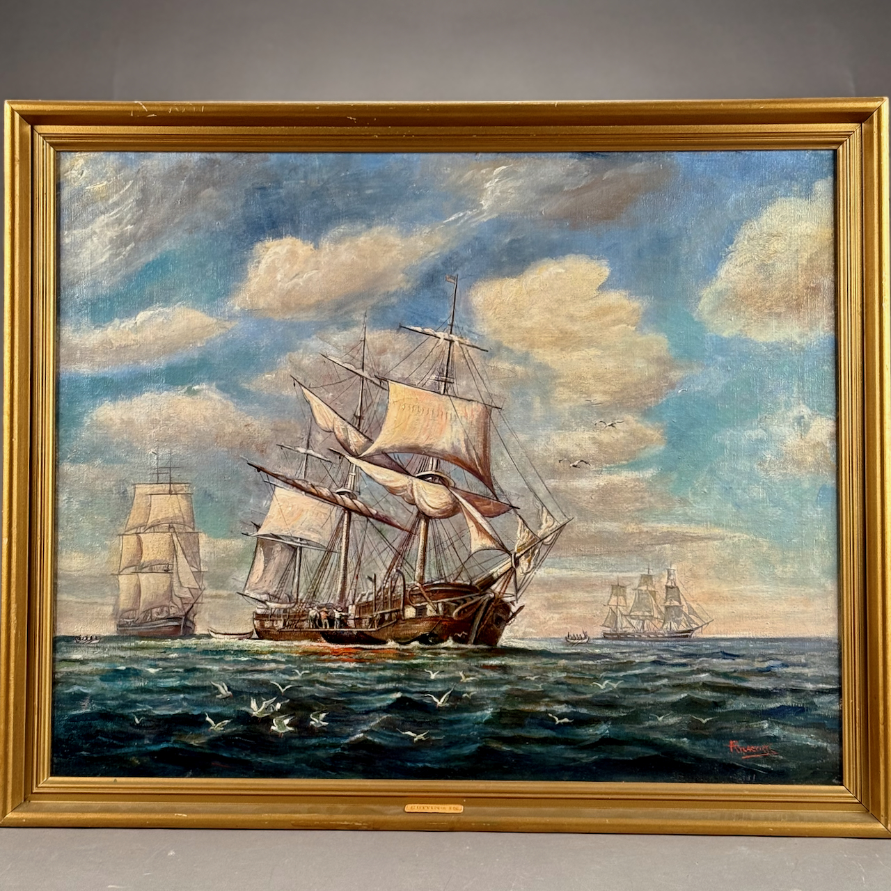 Home / ANTIQUE ESTATE AUCTION - FRI DECEMBER 12 AT 6 PM / LOT 021 ADOLPH J. FREDERICK, WHALING SHIPS, OIL ON CANVAS, SIGNED LOWER RIGHT, FRAMED. 24-1/4 X 30 LOT 021 ADOLPH J. FREDERICK, WHALING SHIPS, OIL ON CANVAS, SIGNED LOWER RIGHT, FRAMED. 24-1/4 X 30 Place a Bid Category: ANTIQUE ESTATE AUCTION - FRI DECEMBER 12 AT 6 PM Tag: auction Related products LOT 002 3 PC STERLING SILVER TEA SET BY GORHAM CONSISTING OF 10″ TEAPOT (2441), 6-1/2″ CREAMER (2444), 6″ COVERED SUGAR (2443), 45 OZT LOT 015 42 PC STERLING FLATWARE SET BY LUNT IN THE ‘WILLIAM & MARY’ PATTERN, NO MONOGRAM. 34.5 OZT (W/O 12 KNIVES) LOT 013 3 PCS OF STERLING SILVER: (1) OVAL DEEP SERVING DISH BY E. CALDWELL & CO, 10 X 6-1/2. (2) PORRINGER BY DOMINICK & HAFF, 7″. (3) PORRINGER BY RWM, 6″. 21.8 OZT LOT 004 133 PC STERLING SILVER FLATWARE SET IN THE “KING PATTERN. 190 OZT (EXCLUDING 12 KNIVES), MONOGRAMMED