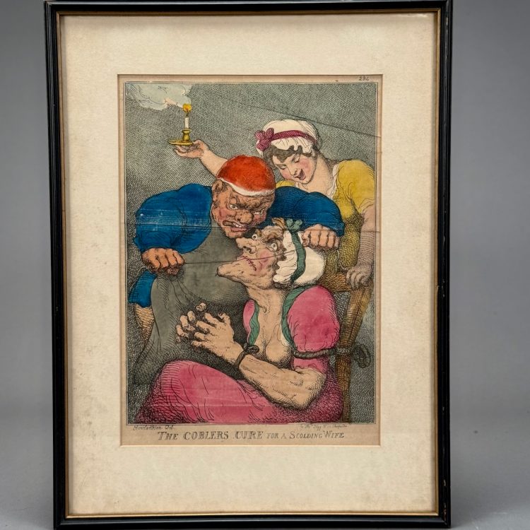 Home / ANTIQUE AUCTION - FRI OCTOBER 3 AT 6 PM / LOT 023 THOMAS ROWLANDSON, “THE COBBLER’S CURE FOR A SCOLDING WIFE” HAND COLORED ETCHING, FRAMED. 13 X 9-1/4 SIGHT SIZE LOT 023 THOMAS ROWLANDSON, “THE COBBLER’S CURE FOR A SCOLDING WIFE” HAND COLORED ETCHING, FRAMED. 13 X 9-1/4 SIGHT SIZE Place a Bid Categories: ANTIQUE AUCTION - FRI OCTOBER 3 AT 6 PM, OCTOBER 3 AT 6 PM Tag: auction Related products LOT 014 PAIR OF STERLING SILVER 2 HANDLED PLATES BY WEBSTER MARKED ‘6613’, NO MONOGRAM, 10-1/2 AT WIDEST, 21.3 OZT LOT 019 COIN SILVER MUG BY C. BARD & SON, PHILADELPHIA, PA, CIRCA 1850 INSCRIBED ‘ANNA CRAIG FULTON’, THE BODY HAVING REPOUSSE FLOWERS. 3-1/2″(H), 3.3 OZT LOT 010 2 STERLING SILVER SHAKERS, ONE 6″(H) WITH BLURRED ENGLISH HALLMARKS, THE OTHER 6-1/2″(H) MARKED STERLING. 9 OZT LOT 020 STERLING SILVER HINGED SQUARE BOX, LONDON, 1806, MAKERS MARK RH?, THE LID WITH A REPOUSSE SCENE OF 2 MEN PLAYING A BOARD GAME. 1-1/4″(H), 4″(W), 4″(D)