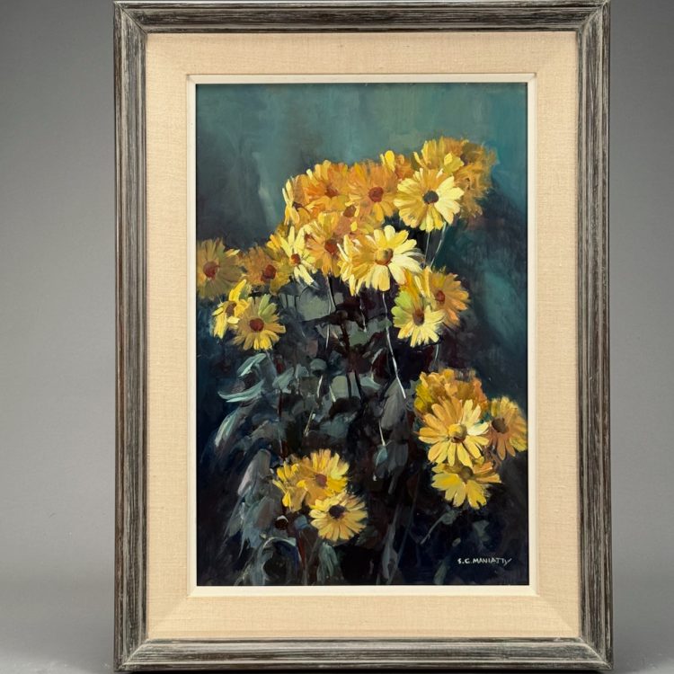 Home / OCTOBER 3 AT 6 PM / LOT 030 STEPHEN G. MANIATTY, “YELLOW MUMS”, OIL ON MASONITE, SIGNED LOWER RIGHT, FRAMED. 24 X 16 LOT 030 STEPHEN G. MANIATTY, “YELLOW MUMS”, OIL ON MASONITE, SIGNED LOWER RIGHT, FRAMED. 24 X 16 Place a Bid Categories: ANTIQUE AUCTION - FRI OCTOBER 3 AT 6 PM, OCTOBER 3 AT 6 PM Tag: auction Related products LOT 015 42 PC STERLING FLATWARE SET BY LUNT IN THE ‘WILLIAM & MARY’ PATTERN, NO MONOGRAM. 34.5 OZT (W/O 12 KNIVES) LOT 023 STEPHEN G. MANIATTY, ‘SAWMILL’, OIL ON CANVAS, SIGNED LOWER RIGHT, FRAMED WITH AN AWARD PLAQUE “GRUMBACHER ARTISTS MATERIAL AWARD/GRAND NATIONAL EXHIBITION/NEW YORK CITY – 1965”. 20 X 30 LOT 002 3 PC STERLING SILVER TEA SET BY GORHAM CONSISTING OF 10″ TEAPOT (2441), 6-1/2″ CREAMER (2444), 6″ COVERED SUGAR (2443), 45 OZT LOT 013 3 PCS OF STERLING SILVER: (1) OVAL DEEP SERVING DISH BY E. CALDWELL & CO, 10 X 6-1/2. (2) PORRINGER BY DOMINICK & HAFF, 7″. (3) PORRINGER BY RWM, 6″. 21.8 OZT