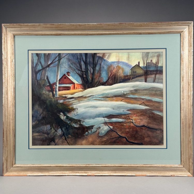 Home / OCTOBER 3 AT 6 PM / LOT 037 STEPHEN G. MANIATTY, RED BARN IN EARLY SPRING, WATERCOLOR, UNSIGNED, FRAMED. 17-3/4 X 25 SIGHT SIZE LOT 037 STEPHEN G. MANIATTY, RED BARN IN EARLY SPRING, WATERCOLOR, UNSIGNED, FRAMED. 17-3/4 X 25 SIGHT SIZE Place a Bid Categories: ANTIQUE AUCTION - FRI OCTOBER 3 AT 6 PM, OCTOBER 3 AT 6 PM Tag: auction Related products LOT 016 6 PCS OF STERLING SILVER: (1) 6″(D) PLATE BY TOWLE. (2) 3-1/2 FOOTED CREAMER BY POOLE. (3) 4″(D) FOOTED BOWL BY SHREVE, CRUMP & LOW CO (4) 7″(L) FOOTED GRAVY BY J.E. CALDWELL & CO (5) 4″ CREAMER BY DOMINICK & HAFF (6) 6-3/4″(W) DISH BY TOWLE. 25.2 OZT LOT 022 STEPHEN G. MANIATTY, ‘BUCKET OF POSIES’, OIL ON CANVAS, SIGNED LOWER RIGHT, FRAMED. 38 X 36 LOT 006 FINE PAIR OF FANCY STERLING SILVER CANDLESTICKS, SHEFFIELD, 1903-4 WITH MAKER’S MARK ‘HE LD’, 12″(H) LOT 023 STEPHEN G. MANIATTY, ‘SAWMILL’, OIL ON CANVAS, SIGNED LOWER RIGHT, FRAMED WITH AN AWARD PLAQUE “GRUMBACHER ARTISTS MATERIAL AWARD/GRAND NATIONAL EXHIBITION/NEW YORK CITY – 1965”. 20 X 30