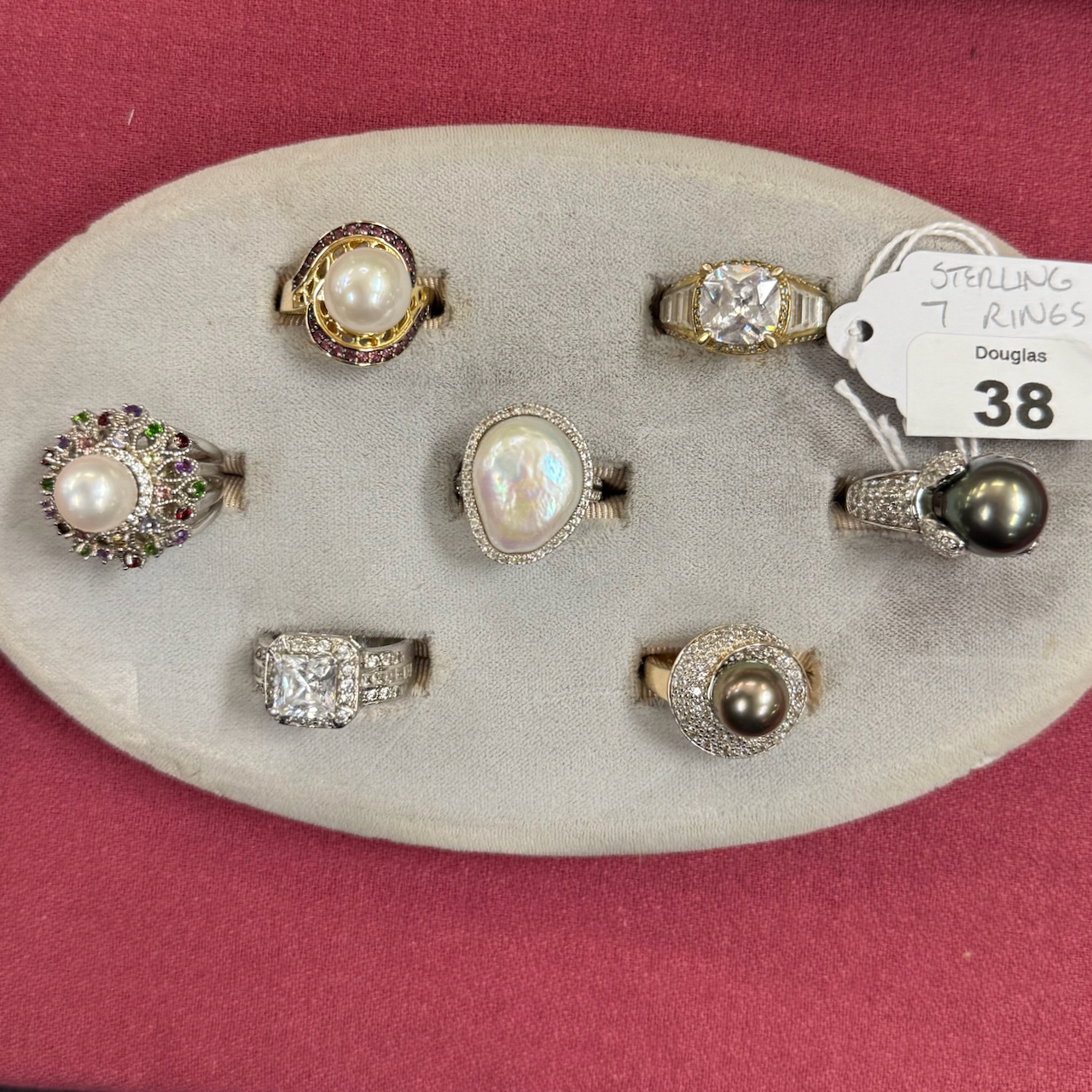 Home / LARGE ESTATE AUCTION - FRI JANUARY 16 AT 6 PM / LOT 038 SEVEN STERLING RINGS LOT 038 SEVEN STERLING RINGS Place a Bid Category: LARGE ESTATE AUCTION - FRI JANUARY 16 AT 6 PM Tag: auction Related products LOT 010 2 STERLING SILVER SHAKERS, ONE 6″(H) WITH BLURRED ENGLISH HALLMARKS, THE OTHER 6-1/2″(H) MARKED STERLING. 9 OZT LOT 011 4 PCS OF ENGLISH STERLING SILVER. (1) EXPANDING TOAST RACK, 1901-1902, LONDON, 3″(H). (2) 3″ TEA CADDY SPOON, 1796-7, LONDON. (3) 7″ RETICULATED 2 HANDLED DISH, 1906-7, BIRMINGHAM. (4) 2″(H) TANKARD SHAPED MUSTARD WITH COBALT LINER, 1902-3, BIRMINGHAM. 12.6 OZT (W/O LINER) LOT 017 CONTINENTAL SILVER (.800) DRESSER BOX MARKED ON BASE ‘BEUTHNER’. 3-1/4″(H), 5-1/2″(W) X 4″(D), 8 OZT LOT 022 STEPHEN G. MANIATTY, ‘BUCKET OF POSIES’, OIL ON CANVAS, SIGNED LOWER RIGHT, FRAMED. 38 X 36