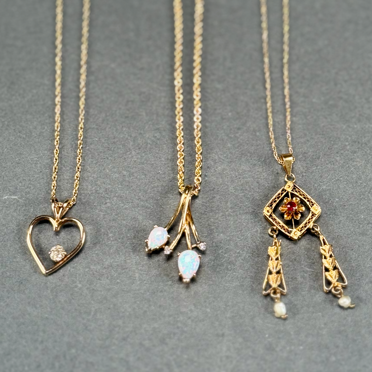 Home / ANTIQUE ESTATE AUCTION - FRI MARCH 27 AT 6 PM / LOT 046 THREE 14K YG NECKLACES, 1 WITH SMALL DIAMOND, ANOTHER WITH 2 OPALS AND THE LAST WITH RED STONE. 7.6 DWT (11.86 G) LOT 046 THREE 14K YG NECKLACES, 1 WITH SMALL DIAMOND, ANOTHER WITH 2 OPALS AND THE LAST WITH RED STONE. 7.6 DWT (11.86 G) Place a Bid Category: ANTIQUE ESTATE AUCTION - FRI MARCH 27 AT 6 PM Tag: auction Related products LOT 015 42 PC STERLING FLATWARE SET BY LUNT IN THE ‘WILLIAM & MARY’ PATTERN, NO MONOGRAM. 34.5 OZT (W/O 12 KNIVES) LOT 003 PAIR OF STERLING SILVER PORRINGERS BY GEBELEIN, BOSTON. 7″(L), 4-3/4 BOWL, 12 OZT LOT 006 FINE PAIR OF FANCY STERLING SILVER CANDLESTICKS, SHEFFIELD, 1903-4 WITH MAKER’S MARK ‘HE LD’, 12″(H) LOT 010 2 STERLING SILVER SHAKERS, ONE 6″(H) WITH BLURRED ENGLISH HALLMARKS, THE OTHER 6-1/2″(H) MARKED STERLING. 9 OZT
