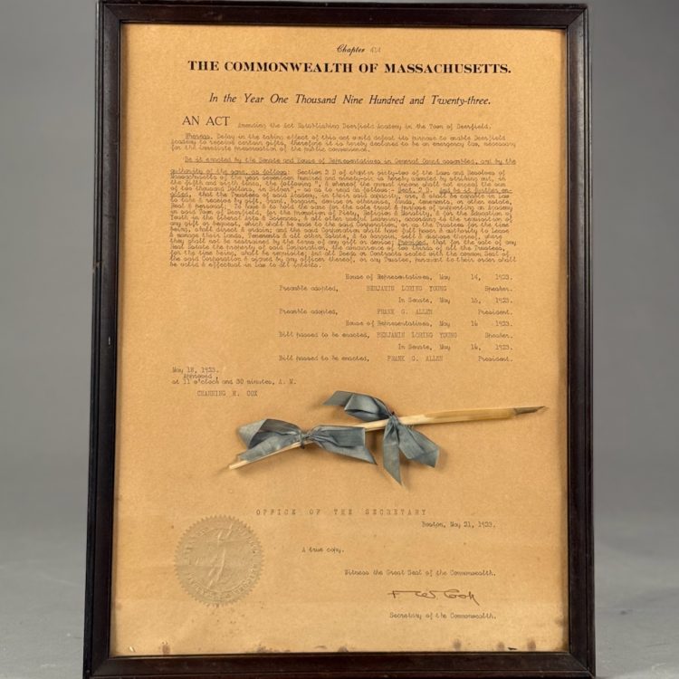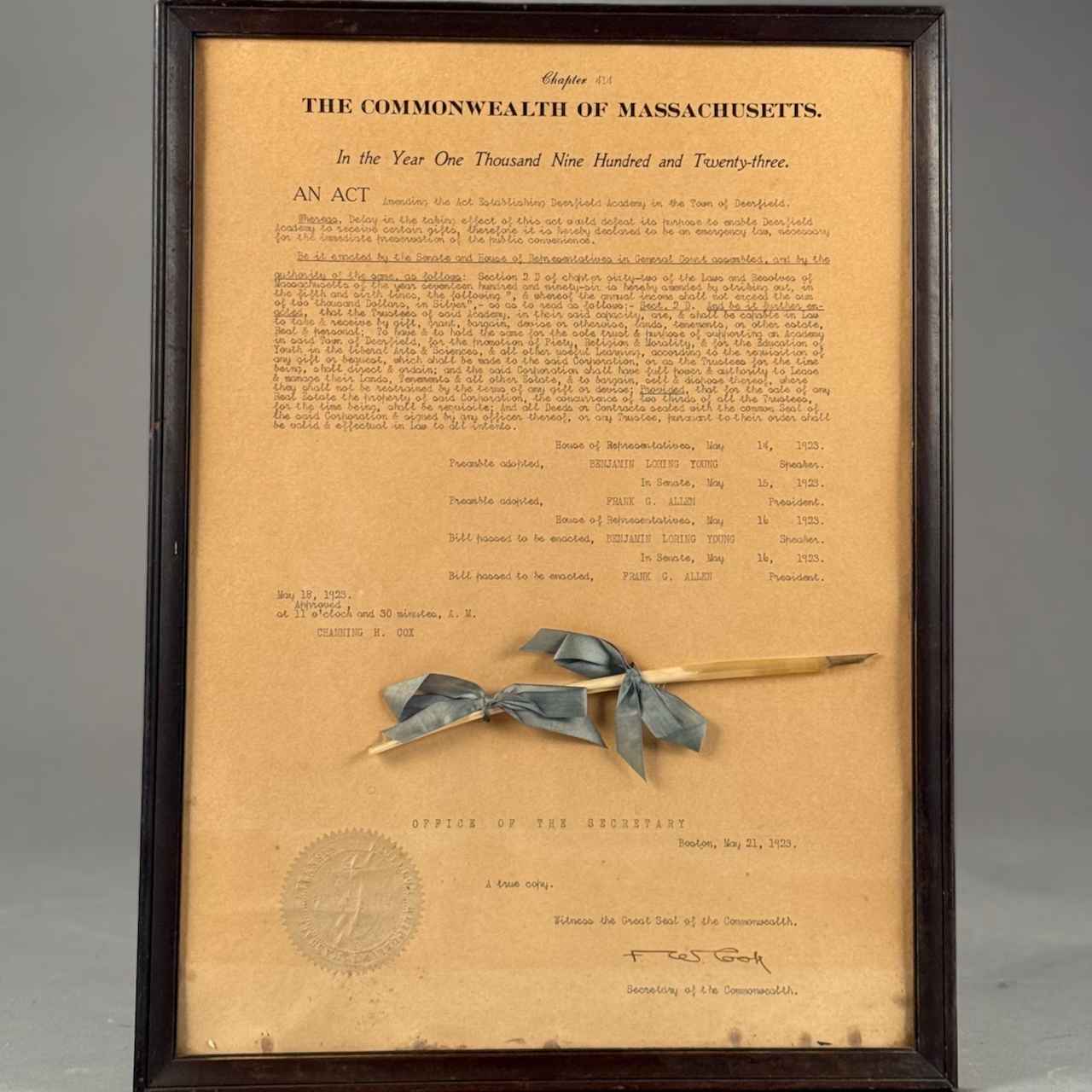 Home / ANTIQUE AUCTION - FRI OCTOBER 3 AT 6 PM / LOT 050 FRAMED DOCUMENT DATED, BOSTON, MAY 21, 1923, “AMENDING THE ACT ESTABLISHING DEERFIELD ACADEMY IN THE TOWN OF DEERFIELD” FRAMED WITH A BLUE RIBBON ADORNED QUILL PEN, 17-1/2 X 12-1/2 SIGHT SIZE LOT 050 FRAMED DOCUMENT DATED, BOSTON, MAY 21, 1923, “AMENDING THE ACT ESTABLISHING DEERFIELD ACADEMY IN THE TOWN OF DEERFIELD” FRAMED WITH A BLUE RIBBON ADORNED QUILL PEN, 17-1/2 X 12-1/2 SIGHT SIZE Place a Bid Categories: ANTIQUE AUCTION - FRI OCTOBER 3 AT 6 PM, OCTOBER 3 AT 6 PM Tag: auction Related products LOT 006 FINE PAIR OF FANCY STERLING SILVER CANDLESTICKS, SHEFFIELD, 1903-4 WITH MAKER’S MARK ‘HE LD’, 12″(H) LOT 004 133 PC STERLING SILVER FLATWARE SET IN THE “KING PATTERN. 190 OZT (EXCLUDING 12 KNIVES), MONOGRAMMED LOT 014 PAIR OF STERLING SILVER 2 HANDLED PLATES BY WEBSTER MARKED ‘6613’, NO MONOGRAM, 10-1/2 AT WIDEST, 21.3 OZT LOT 024 STEPHEN G. MANIATTY, ‘OCTOBERS GIFT’, OIL ON CANVAS, SIGNED LOWER RIGHT, FRAMED. 34 X 25