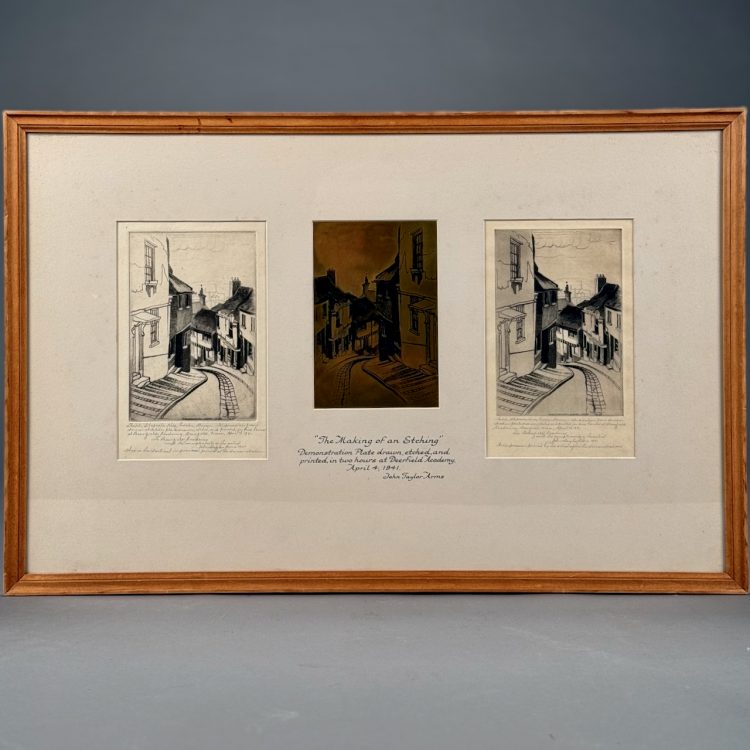Home / OCTOBER 3 AT 6 PM / LOT 055 JOHN TAYLOR ARMS, “THE MAKING OF AN ETCHING” 3-PART WORK, INCLUDING AN ETCHING PLATE AND 2 IMPRESSIONS IN ONE FRAME PRESENTATION, 13-1/2 X 21-1/2, SIGHT SIZE LOT 055 JOHN TAYLOR ARMS, “THE MAKING OF AN ETCHING” 3-PART WORK, INCLUDING AN ETCHING PLATE AND 2 IMPRESSIONS IN ONE FRAME PRESENTATION, 13-1/2 X 21-1/2, SIGHT SIZE Place a Bid Categories: ANTIQUE AUCTION - FRI OCTOBER 3 AT 6 PM, OCTOBER 3 AT 6 PM Tag: auction Related products LOT 005 PAIR OF STERLING SILVER CANDELABRAS BY ARROWSMITH, WEIGHTED IN 2 PARTS. 14-1/2″(H) (1 REPAIRED) LOT 012 2 SMALL STERLING SILVER TRAYS. (1) 6″ SQUARE BY DOMINICK & HAFF (2) 7-1/2 X 5-1/2 OVAL FOOTED TRAY BY J.E. CALDWELL & CO, BOTH MONOGRAMMED. 11.7 OZT LOT 002 3 PC STERLING SILVER TEA SET BY GORHAM CONSISTING OF 10″ TEAPOT (2441), 6-1/2″ CREAMER (2444), 6″ COVERED SUGAR (2443), 45 OZT LOT 023 STEPHEN G. MANIATTY, ‘SAWMILL’, OIL ON CANVAS, SIGNED LOWER RIGHT, FRAMED WITH AN AWARD PLAQUE “GRUMBACHER ARTISTS MATERIAL AWARD/GRAND NATIONAL EXHIBITION/NEW YORK CITY – 1965”. 20 X 30