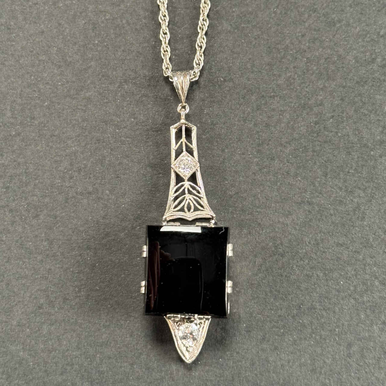 Home / ANTIQUE ESTATE AUCTION - FRI JANUARY 30 AT 6 PM / LOT 064 UNMARKED WHITE GOLD (PROBABLY 14K) 17-1/2″ CHAIN WITH 1-3/4″(L) DIAMOND UNMARKED WHITE GOLD AND BLACK STONE PENDANT. CHAIN 1.5 DWT (2.5 G), PENDANT 2.7 DWT (4.2 G) LOT 064 UNMARKED WHITE GOLD (PROBABLY 14K) 17-1/2″ CHAIN WITH 1-3/4″(L) DIAMOND UNMARKED WHITE GOLD AND BLACK STONE PENDANT. CHAIN 1.5 DWT (2.5 G), PENDANT 2.7 DWT (4.2 G) Place a Bid Category: ANTIQUE ESTATE AUCTION - FRI JANUARY 30 AT 6 PM Tag: auction Related products LOT 008 11 STERLING SILVER PLATES BY GORHAM. 6″(D), 27.8 OZT LOT 009 48 PC STERLING SILVER FLATWARE SET IN THE “KING GEORGE” PATTERN BY GORHAM, 57 OZT (WITHOUT 16 KNIVES) MONOGRAMMED LOT 004 133 PC STERLING SILVER FLATWARE SET IN THE “KING PATTERN. 190 OZT (EXCLUDING 12 KNIVES), MONOGRAMMED LOT 006 FINE PAIR OF FANCY STERLING SILVER CANDLESTICKS, SHEFFIELD, 1903-4 WITH MAKER’S MARK ‘HE LD’, 12″(H)