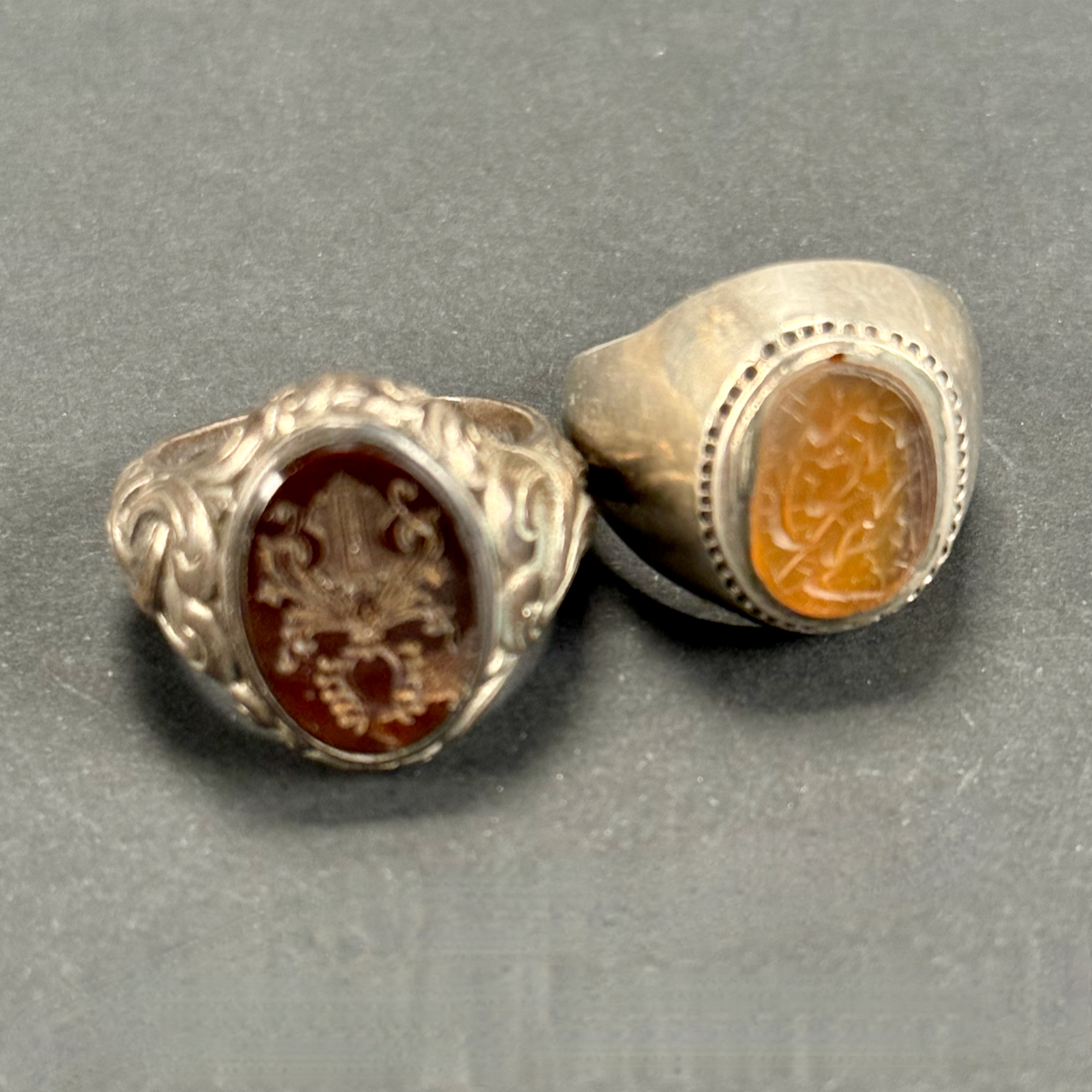 Home / ANTIQUE ESTATE AUCTION - FRI JANUARY 30 AT 6 PM / LOT 070 TWO INTAGLIO CUT STONE RINGS, ONE WITH FAMILY CREST SIZE 9-1/2, THE OTHER WITH ARABIC WRITING SIZE 9-1/2 LOT 070 TWO INTAGLIO CUT STONE RINGS, ONE WITH FAMILY CREST SIZE 9-1/2, THE OTHER WITH ARABIC WRITING SIZE 9-1/2 Place a Bid Category: ANTIQUE ESTATE AUCTION - FRI JANUARY 30 AT 6 PM Tag: auction Related products LOT 016 6 PCS OF STERLING SILVER: (1) 6″(D) PLATE BY TOWLE. (2) 3-1/2 FOOTED CREAMER BY POOLE. (3) 4″(D) FOOTED BOWL BY SHREVE, CRUMP & LOW CO (4) 7″(L) FOOTED GRAVY BY J.E. CALDWELL & CO (5) 4″ CREAMER BY DOMINICK & HAFF (6) 6-3/4″(W) DISH BY TOWLE. 25.2 OZT LOT 011 4 PCS OF ENGLISH STERLING SILVER. (1) EXPANDING TOAST RACK, 1901-1902, LONDON, 3″(H). (2) 3″ TEA CADDY SPOON, 1796-7, LONDON. (3) 7″ RETICULATED 2 HANDLED DISH, 1906-7, BIRMINGHAM. (4) 2″(H) TANKARD SHAPED MUSTARD WITH COBALT LINER, 1902-3, BIRMINGHAM. 12.6 OZT (W/O LINER) LOT 002 3 PC STERLING SILVER TEA SET BY GORHAM CONSISTING OF 10″ TEAPOT (2441), 6-1/2″ CREAMER (2444), 6″ COVERED SUGAR (2443), 45 OZT LOT 023 STEPHEN G. MANIATTY, ‘SAWMILL’, OIL ON CANVAS, SIGNED LOWER RIGHT, FRAMED WITH AN AWARD PLAQUE “GRUMBACHER ARTISTS MATERIAL AWARD/GRAND NATIONAL EXHIBITION/NEW YORK CITY – 1965”. 20 X 30