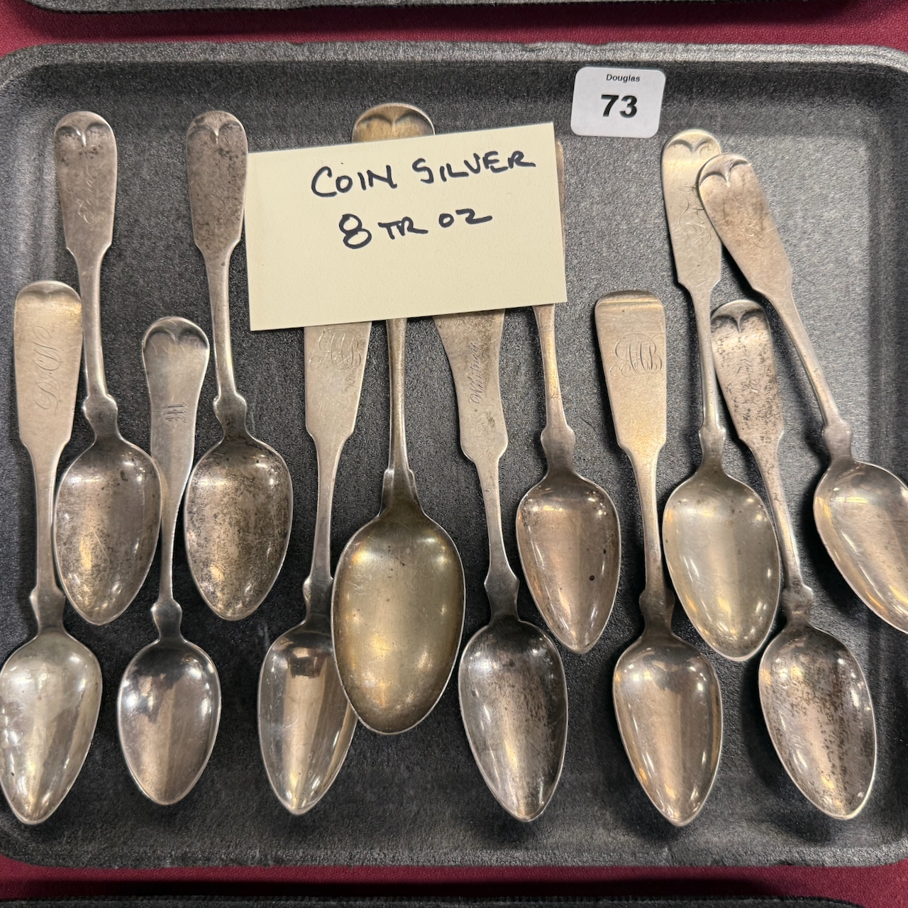 Home / LARGE ESTATE AUCTION - FRI JANUARY 16 AT 6 PM / LOT 073 COIN SILVER FLATWARE, 8 OZT LOT 073 COIN SILVER FLATWARE, 8 OZT Place a Bid Category: LARGE ESTATE AUCTION - FRI JANUARY 16 AT 6 PM Tag: auction Related products LOT 015 42 PC STERLING FLATWARE SET BY LUNT IN THE ‘WILLIAM & MARY’ PATTERN, NO MONOGRAM. 34.5 OZT (W/O 12 KNIVES) LOT 022 STEPHEN G. MANIATTY, ‘BUCKET OF POSIES’, OIL ON CANVAS, SIGNED LOWER RIGHT, FRAMED. 38 X 36 LOT 001 PAIR OF STERLING SILVER COLUMN CANDLESTICKS BY GORHAM MARKED A3207 EACH HAVING REMOVABLE BOBECHES. 10-1/4″(H) LOT 020 STERLING SILVER HINGED SQUARE BOX, LONDON, 1806, MAKERS MARK RH?, THE LID WITH A REPOUSSE SCENE OF 2 MEN PLAYING A BOARD GAME. 1-1/4″(H), 4″(W), 4″(D)