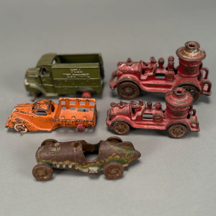 Home / ANTIQUE AUCTION - FRI OCTOBER 3 AT 6 PM / LOT 074 FIVE ANTIQUE CAST IRON TOYS: 6-1/2″ & 5″ RED FIRE ENGINES, 5-1/2″(L) BELL TELEPHONE GREEN TRUCK, 5-1/2″(L) ORANGE TRUCK, AND 5″ RACE CAR LOT 074 FIVE ANTIQUE CAST IRON TOYS: 6-1/2″ & 5″ RED FIRE ENGINES, 5-1/2″(L) BELL TELEPHONE GREEN TRUCK, 5-1/2″(L) ORANGE TRUCK, AND 5″ RACE CAR Place a Bid Categories: ANTIQUE AUCTION - FRI OCTOBER 3 AT 6 PM, OCTOBER 3 AT 6 PM Tag: auction Related products LOT 022 STEPHEN G. MANIATTY, ‘BUCKET OF POSIES’, OIL ON CANVAS, SIGNED LOWER RIGHT, FRAMED. 38 X 36 LOT 005 PAIR OF STERLING SILVER CANDELABRAS BY ARROWSMITH, WEIGHTED IN 2 PARTS. 14-1/2″(H) (1 REPAIRED) LOT 004 133 PC STERLING SILVER FLATWARE SET IN THE “KING PATTERN. 190 OZT (EXCLUDING 12 KNIVES), MONOGRAMMED LOT 019 COIN SILVER MUG BY C. BARD & SON, PHILADELPHIA, PA, CIRCA 1850 INSCRIBED ‘ANNA CRAIG FULTON’, THE BODY HAVING REPOUSSE FLOWERS. 3-1/2″(H), 3.3 OZT