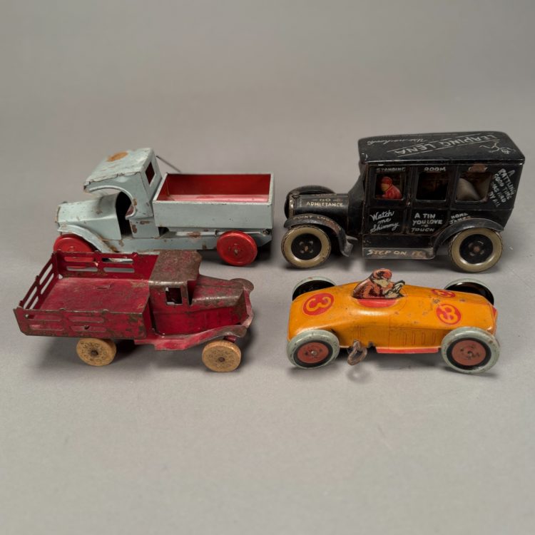 Home / ANTIQUE AUCTION - FRI OCTOBER 3 AT 6 PM / LOT 076 FOUR ANTIQUE TIN TOY CARS AND TRUCKS: (1) 6″(L) WIND-UP RACE CAR. (2) 8″(L) WIND-UP LEAPING LENA TRUCK. (3) 8-1/2″(L) DUMP BODY TRUCK. (4) 7″ RED TRUCK LOT 076 FOUR ANTIQUE TIN TOY CARS AND TRUCKS: (1) 6″(L) WIND-UP RACE CAR. (2) 8″(L) WIND-UP LEAPING LENA TRUCK. (3) 8-1/2″(L) DUMP BODY TRUCK. (4) 7″ RED TRUCK Place a Bid Categories: ANTIQUE AUCTION - FRI OCTOBER 3 AT 6 PM, OCTOBER 3 AT 6 PM Tag: auction Related products LOT 015 42 PC STERLING FLATWARE SET BY LUNT IN THE ‘WILLIAM & MARY’ PATTERN, NO MONOGRAM. 34.5 OZT (W/O 12 KNIVES) LOT 020 STERLING SILVER HINGED SQUARE BOX, LONDON, 1806, MAKERS MARK RH?, THE LID WITH A REPOUSSE SCENE OF 2 MEN PLAYING A BOARD GAME. 1-1/4″(H), 4″(W), 4″(D) LOT 019 COIN SILVER MUG BY C. BARD & SON, PHILADELPHIA, PA, CIRCA 1850 INSCRIBED ‘ANNA CRAIG FULTON’, THE BODY HAVING REPOUSSE FLOWERS. 3-1/2″(H), 3.3 OZT LOT 003 PAIR OF STERLING SILVER PORRINGERS BY GEBELEIN, BOSTON. 7″(L), 4-3/4 BOWL, 12 OZT