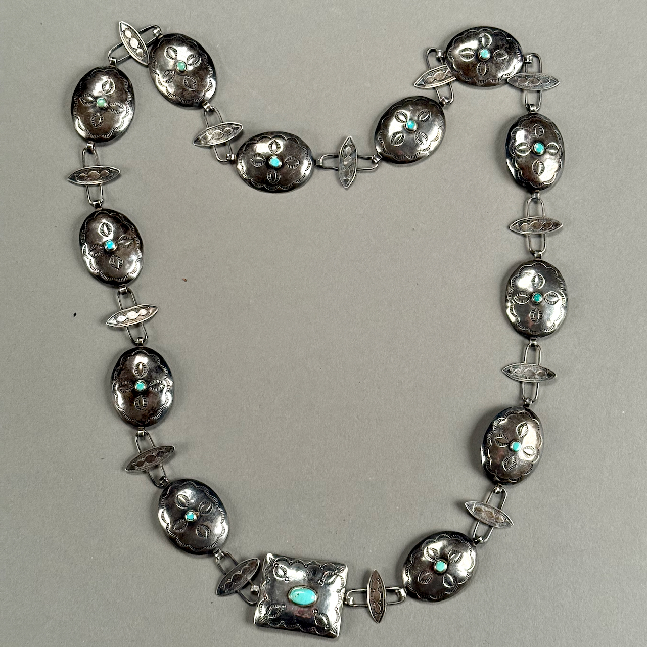 Home / ANTIQUE ESTATE AUCTION - FRI JANUARY 30 AT 6 PM / LOT 078 SMALL SILVER AND TURQUOISE CONCHO BELT, 13 LINKS, UNMARKED. 33″(L), 2.7 OZT LOT 078 SMALL SILVER AND TURQUOISE CONCHO BELT, 13 LINKS, UNMARKED. 33″(L), 2.7 OZT Place a Bid Category: ANTIQUE ESTATE AUCTION - FRI JANUARY 30 AT 6 PM Tag: auction Related products LOT 020 STERLING SILVER HINGED SQUARE BOX, LONDON, 1806, MAKERS MARK RH?, THE LID WITH A REPOUSSE SCENE OF 2 MEN PLAYING A BOARD GAME. 1-1/4″(H), 4″(W), 4″(D) LOT 009 48 PC STERLING SILVER FLATWARE SET IN THE “KING GEORGE” PATTERN BY GORHAM, 57 OZT (WITHOUT 16 KNIVES) MONOGRAMMED LOT 008 11 STERLING SILVER PLATES BY GORHAM. 6″(D), 27.8 OZT LOT 006 FINE PAIR OF FANCY STERLING SILVER CANDLESTICKS, SHEFFIELD, 1903-4 WITH MAKER’S MARK ‘HE LD’, 12″(H)
