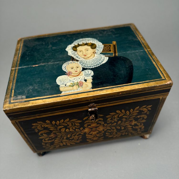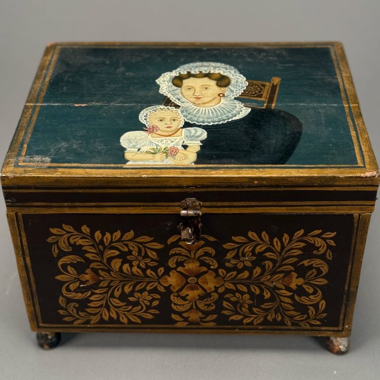 Home / ANTIQUE AUCTION - FRI OCTOBER 3 AT 6 PM / LOT 091 HINGED LID DRESSER TOP LADY’S BOX WITH PORTRAIT OF A MOTHER AND CHILD ON LID. SHE SITS IN A STENCILED WINDSOR CHAIR AGAINST A BLUE BACKGROUND, THE FOUR SIDES WITH GOLD DECORATION ON A BROWN BACKGROUND. 8-3/4″(H), 12″(W), 9″(D) LOT 091 HINGED LID DRESSER TOP LADY’S BOX WITH PORTRAIT OF A MOTHER AND CHILD ON LID. SHE SITS IN A STENCILED WINDSOR CHAIR AGAINST A BLUE BACKGROUND, THE FOUR SIDES WITH GOLD DECORATION ON A BROWN BACKGROUND. 8-3/4″(H), 12″(W), 9″(D) Place a Bid Categories: ANTIQUE AUCTION - FRI OCTOBER 3 AT 6 PM, OCTOBER 3 AT 6 PM Tag: auction Related products LOT 013 3 PCS OF STERLING SILVER: (1) OVAL DEEP SERVING DISH BY E. CALDWELL & CO, 10 X 6-1/2. (2) PORRINGER BY DOMINICK & HAFF, 7″. (3) PORRINGER BY RWM, 6″. 21.8 OZT LOT 007 FIXED HANDLED STERLING SILVER LOW BASKET MARKED BIGELOW, KENNARD & CO. 5-1/2″(H), 10-1/2″(D), 9.8 OZT LOT 002 3 PC STERLING SILVER TEA SET BY GORHAM CONSISTING OF 10″ TEAPOT (2441), 6-1/2″ CREAMER (2444), 6″ COVERED SUGAR (2443), 45 OZT LOT 011 4 PCS OF ENGLISH STERLING SILVER. (1) EXPANDING TOAST RACK, 1901-1902, LONDON, 3″(H). (2) 3″ TEA CADDY SPOON, 1796-7, LONDON. (3) 7″ RETICULATED 2 HANDLED DISH, 1906-7, BIRMINGHAM. (4) 2″(H) TANKARD SHAPED MUSTARD WITH COBALT LINER, 1902-3, BIRMINGHAM. 12.6 OZT (W/O LINER)