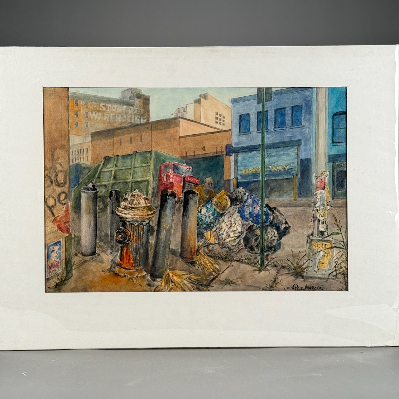 Home / ESTATE COLLECTION OF AMERICAN ARTIST JACK PAUL MAROON DECEMBER 19 AT 6PM / LOT 093 GARBAGE PICK-UP, WATERCOLOR, SIGNED. 14 X 20-1/2 SIGHT SIZE, IN MAT LOT 093 GARBAGE PICK-UP, WATERCOLOR, SIGNED. 14 X 20-1/2 SIGHT SIZE, IN MAT Place a Bid Category: ESTATE COLLECTION OF AMERICAN ARTIST JACK PAUL MAROON DECEMBER 19 AT 6PM Tag: auction Related products LOT 014 PAIR OF STERLING SILVER 2 HANDLED PLATES BY WEBSTER MARKED ‘6613’, NO MONOGRAM, 10-1/2 AT WIDEST, 21.3 OZT LOT 017 CONTINENTAL SILVER (.800) DRESSER BOX MARKED ON BASE ‘BEUTHNER’. 3-1/4″(H), 5-1/2″(W) X 4″(D), 8 OZT LOT 010 2 STERLING SILVER SHAKERS, ONE 6″(H) WITH BLURRED ENGLISH HALLMARKS, THE OTHER 6-1/2″(H) MARKED STERLING. 9 OZT LOT 016 6 PCS OF STERLING SILVER: (1) 6″(D) PLATE BY TOWLE. (2) 3-1/2 FOOTED CREAMER BY POOLE. (3) 4″(D) FOOTED BOWL BY SHREVE, CRUMP & LOW CO (4) 7″(L) FOOTED GRAVY BY J.E. CALDWELL & CO (5) 4″ CREAMER BY DOMINICK & HAFF (6) 6-3/4″(W) DISH BY TOWLE. 25.2 OZT