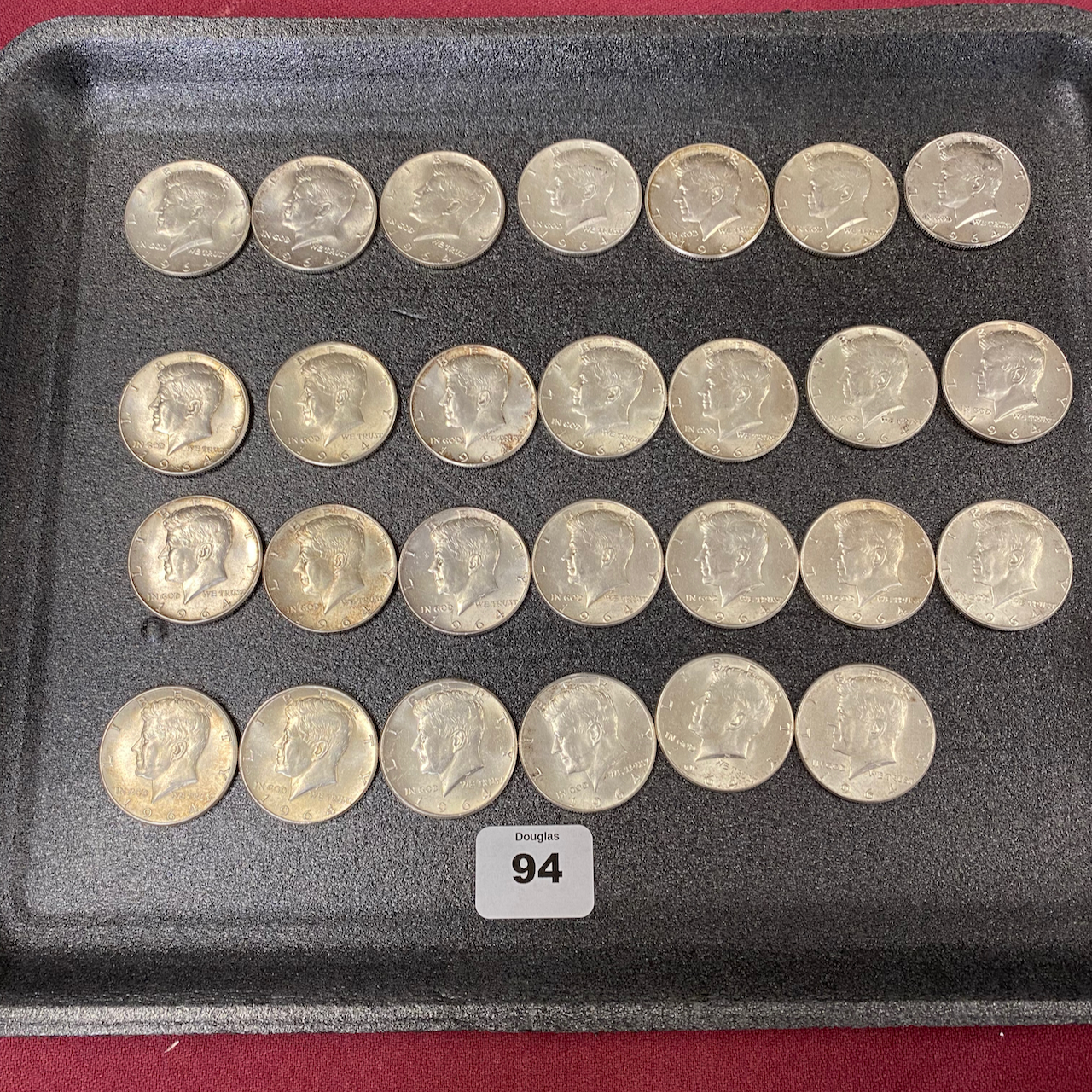 Home / LARGE ESTATE AUCTION - FRI JANUARY 16 AT 6 PM / LOT 094 (27) 1964 KENNEDY HALVES LOT 094 (27) 1964 KENNEDY HALVES Place a Bid Category: LARGE ESTATE AUCTION - FRI JANUARY 16 AT 6 PM Tag: auction Related products LOT 002 3 PC STERLING SILVER TEA SET BY GORHAM CONSISTING OF 10″ TEAPOT (2441), 6-1/2″ CREAMER (2444), 6″ COVERED SUGAR (2443), 45 OZT LOT 014 PAIR OF STERLING SILVER 2 HANDLED PLATES BY WEBSTER MARKED ‘6613’, NO MONOGRAM, 10-1/2 AT WIDEST, 21.3 OZT LOT 007 FIXED HANDLED STERLING SILVER LOW BASKET MARKED BIGELOW, KENNARD & CO. 5-1/2″(H), 10-1/2″(D), 9.8 OZT LOT 005 PAIR OF STERLING SILVER CANDELABRAS BY ARROWSMITH, WEIGHTED IN 2 PARTS. 14-1/2″(H) (1 REPAIRED)