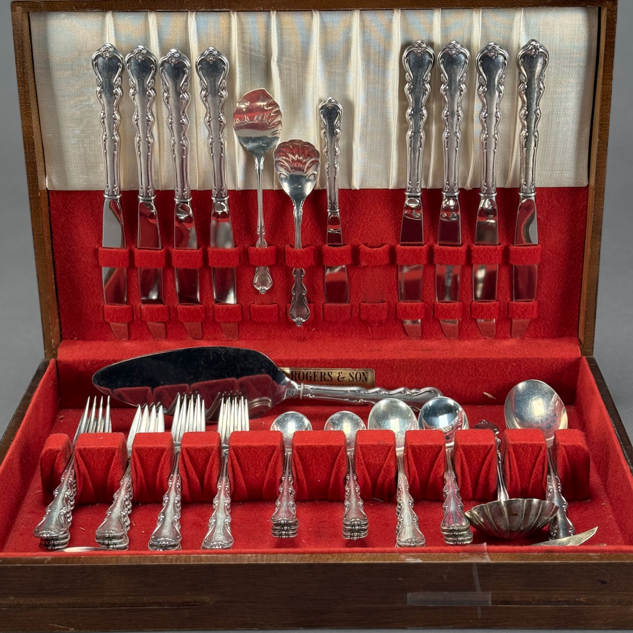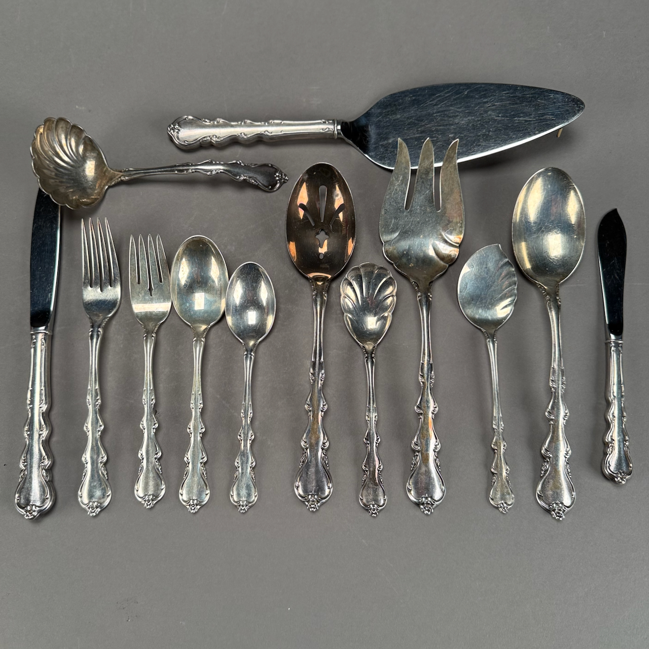 Home / ANTIQUE AUCTION - FRI NOVEMBER 7 AT 6 PM / LOT 094 FIFTY PC STERLING SILVER FLATWARE SET BY INTERNATIONAL IN THE “ANGELIQUE” PATTERN. 58 OZT (WITHOUT 8 KNIVES & 2 SERVING PCS) LOT 094 FIFTY PC STERLING SILVER FLATWARE SET BY INTERNATIONAL IN THE “ANGELIQUE” PATTERN. 58 OZT (WITHOUT 8 KNIVES & 2 SERVING PCS) Place a Bid Category: ANTIQUE AUCTION - FRI NOVEMBER 7 AT 6 PM Tag: auction Related products LOT 013 3 PCS OF STERLING SILVER: (1) OVAL DEEP SERVING DISH BY E. CALDWELL & CO, 10 X 6-1/2. (2) PORRINGER BY DOMINICK & HAFF, 7″. (3) PORRINGER BY RWM, 6″. 21.8 OZT LOT 016 6 PCS OF STERLING SILVER: (1) 6″(D) PLATE BY TOWLE. (2) 3-1/2 FOOTED CREAMER BY POOLE. (3) 4″(D) FOOTED BOWL BY SHREVE, CRUMP & LOW CO (4) 7″(L) FOOTED GRAVY BY J.E. CALDWELL & CO (5) 4″ CREAMER BY DOMINICK & HAFF (6) 6-3/4″(W) DISH BY TOWLE. 25.2 OZT LOT 020 STERLING SILVER HINGED SQUARE BOX, LONDON, 1806, MAKERS MARK RH?, THE LID WITH A REPOUSSE SCENE OF 2 MEN PLAYING A BOARD GAME. 1-1/4″(H), 4″(W), 4″(D) LOT 005 PAIR OF STERLING SILVER CANDELABRAS BY ARROWSMITH, WEIGHTED IN 2 PARTS. 14-1/2″(H) (1 REPAIRED)