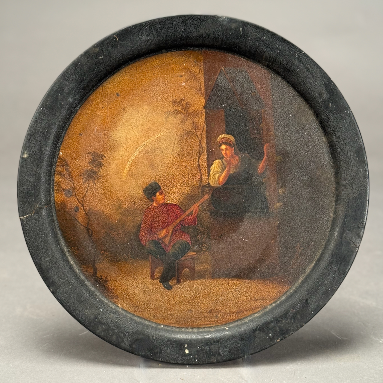 Home / ANTIQUE ESTATE AUCTION - FRI DECEMBER 12 AT 6 PM / LOT 099 RUSSIAN LACQUER ROUND PAPER MACHE TRAY WITH HAND PAINTED SCENE OF MAN PLAYING MUSICAL INSTRUMENT TO WOMAN OUTSIDE WINDOW. 12″(D) LOT 099 RUSSIAN LACQUER ROUND PAPER MACHE TRAY WITH HAND PAINTED SCENE OF MAN PLAYING MUSICAL INSTRUMENT TO WOMAN OUTSIDE WINDOW. 12″(D) Place a Bid Category: ANTIQUE ESTATE AUCTION - FRI DECEMBER 12 AT 6 PM Tag: auction Related products LOT 014 PAIR OF STERLING SILVER 2 HANDLED PLATES BY WEBSTER MARKED ‘6613’, NO MONOGRAM, 10-1/2 AT WIDEST, 21.3 OZT LOT 012 2 SMALL STERLING SILVER TRAYS. (1) 6″ SQUARE BY DOMINICK & HAFF (2) 7-1/2 X 5-1/2 OVAL FOOTED TRAY BY J.E. CALDWELL & CO, BOTH MONOGRAMMED. 11.7 OZT LOT 015 42 PC STERLING FLATWARE SET BY LUNT IN THE ‘WILLIAM & MARY’ PATTERN, NO MONOGRAM. 34.5 OZT (W/O 12 KNIVES) LOT 001 PAIR OF STERLING SILVER COLUMN CANDLESTICKS BY GORHAM MARKED A3207 EACH HAVING REMOVABLE BOBECHES. 10-1/4″(H)