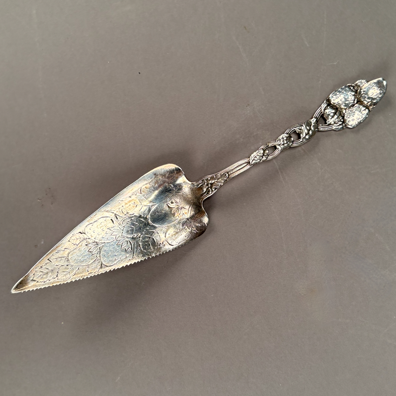 Home / ANTIQUE AUCTION - FRI NOVEMBER 7 AT 6 PM / LOT 105 STERLING SILVER FLATWARE SERVING PIECES. 11″ PIE SERVER IN A STRAWBERRY PATTERN 4 TR OZ. LOT 105 STERLING SILVER FLATWARE SERVING PIECES. 11″ PIE SERVER IN A STRAWBERRY PATTERN 4 TR OZ. Place a Bid Category: ANTIQUE AUCTION - FRI NOVEMBER 7 AT 6 PM Tag: auction Related products LOT 014 PAIR OF STERLING SILVER 2 HANDLED PLATES BY WEBSTER MARKED ‘6613’, NO MONOGRAM, 10-1/2 AT WIDEST, 21.3 OZT LOT 013 3 PCS OF STERLING SILVER: (1) OVAL DEEP SERVING DISH BY E. CALDWELL & CO, 10 X 6-1/2. (2) PORRINGER BY DOMINICK & HAFF, 7″. (3) PORRINGER BY RWM, 6″. 21.8 OZT LOT 017 CONTINENTAL SILVER (.800) DRESSER BOX MARKED ON BASE ‘BEUTHNER’. 3-1/4″(H), 5-1/2″(W) X 4″(D), 8 OZT LOT 004 133 PC STERLING SILVER FLATWARE SET IN THE “KING PATTERN. 190 OZT (EXCLUDING 12 KNIVES), MONOGRAMMED