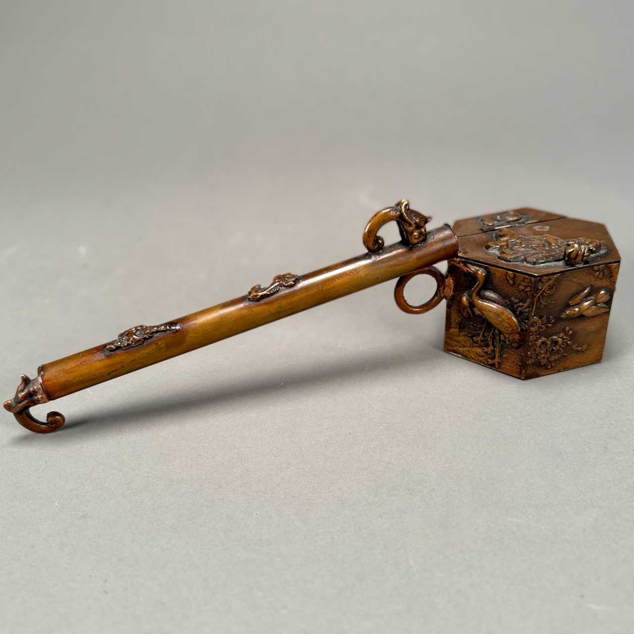 Home / OCTOBER 3 AT 6 PM / LOT 108 19TH & 20TH C. MEIJI JAPANESE BRONZE YATATE BRUSH HOLDER DECORATED WITH BIRDS, MAN ON HORSE AND MORE. 14″(L) LOT 108 19TH & 20TH C. MEIJI JAPANESE BRONZE YATATE BRUSH HOLDER DECORATED WITH BIRDS, MAN ON HORSE AND MORE. 14″(L) Place a Bid Categories: ANTIQUE AUCTION - FRI OCTOBER 3 AT 6 PM, OCTOBER 3 AT 6 PM Tag: auction Related products LOT 003 PAIR OF STERLING SILVER PORRINGERS BY GEBELEIN, BOSTON. 7″(L), 4-3/4 BOWL, 12 OZT LOT 008 11 STERLING SILVER PLATES BY GORHAM. 6″(D), 27.8 OZT LOT 001 PAIR OF STERLING SILVER COLUMN CANDLESTICKS BY GORHAM MARKED A3207 EACH HAVING REMOVABLE BOBECHES. 10-1/4″(H) LOT 010 2 STERLING SILVER SHAKERS, ONE 6″(H) WITH BLURRED ENGLISH HALLMARKS, THE OTHER 6-1/2″(H) MARKED STERLING. 9 OZT