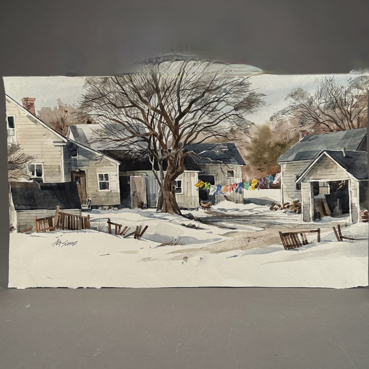 Home / ANTIQUE ESTATE AUCTION - FRI DECEMBER 12 AT 6 PM / LOT 112 ART SCHOLZ, “WINTER WASH”, WATERCOLOR, SIGNED LOWER LEFT, UNFRAMED. 14 X 23-1/2 LOT 112 ART SCHOLZ, “WINTER WASH”, WATERCOLOR, SIGNED LOWER LEFT, UNFRAMED. 14 X 23-1/2 Place a Bid Category: ANTIQUE ESTATE AUCTION - FRI DECEMBER 12 AT 6 PM Tag: auction Related products LOT 024 STEPHEN G. MANIATTY, ‘OCTOBERS GIFT’, OIL ON CANVAS, SIGNED LOWER RIGHT, FRAMED. 34 X 25 LOT 020 STERLING SILVER HINGED SQUARE BOX, LONDON, 1806, MAKERS MARK RH?, THE LID WITH A REPOUSSE SCENE OF 2 MEN PLAYING A BOARD GAME. 1-1/4″(H), 4″(W), 4″(D) LOT 019 COIN SILVER MUG BY C. BARD & SON, PHILADELPHIA, PA, CIRCA 1850 INSCRIBED ‘ANNA CRAIG FULTON’, THE BODY HAVING REPOUSSE FLOWERS. 3-1/2″(H), 3.3 OZT LOT 011 4 PCS OF ENGLISH STERLING SILVER. (1) EXPANDING TOAST RACK, 1901-1902, LONDON, 3″(H). (2) 3″ TEA CADDY SPOON, 1796-7, LONDON. (3) 7″ RETICULATED 2 HANDLED DISH, 1906-7, BIRMINGHAM. (4) 2″(H) TANKARD SHAPED MUSTARD WITH COBALT LINER, 1902-3, BIRMINGHAM. 12.6 OZT (W/O LINER)