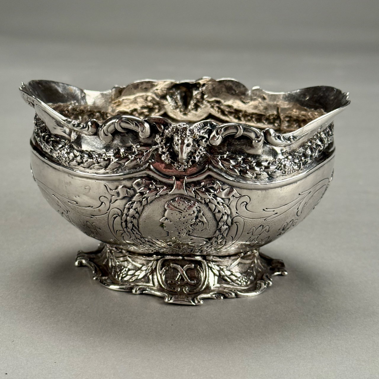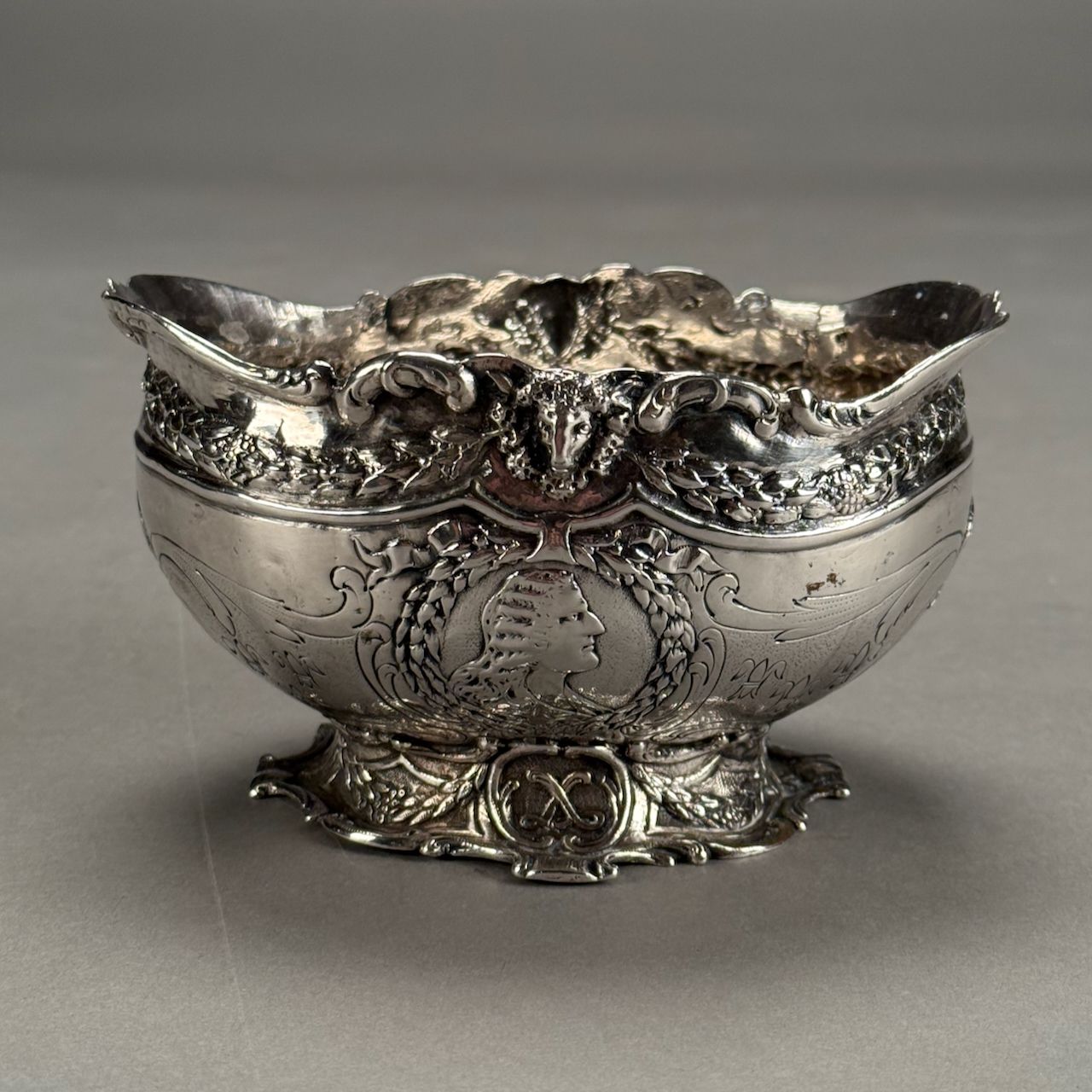 Home / ANTIQUE ESTATE AUCTION - FRI FEBRUARY 20 AT 6 PM / LOT 116 CONTINENTAL SILVER FOOTED BOWL WITH PROFILES OF MAN AND WOMAN, UNMARKED. 3-1/2″(H), 6″ X 4-1/2″, 8.5 OZT LOT 116 CONTINENTAL SILVER FOOTED BOWL WITH PROFILES OF MAN AND WOMAN, UNMARKED. 3-1/2″(H), 6″ X 4-1/2″, 8.5 OZT Place a Bid Category: ANTIQUE ESTATE AUCTION - FRI FEBRUARY 20 AT 6 PM Tag: auction Related products LOT 012 2 SMALL STERLING SILVER TRAYS. (1) 6″ SQUARE BY DOMINICK & HAFF (2) 7-1/2 X 5-1/2 OVAL FOOTED TRAY BY J.E. CALDWELL & CO, BOTH MONOGRAMMED. 11.7 OZT LOT 002 3 PC STERLING SILVER TEA SET BY GORHAM CONSISTING OF 10″ TEAPOT (2441), 6-1/2″ CREAMER (2444), 6″ COVERED SUGAR (2443), 45 OZT LOT 001 PAIR OF STERLING SILVER COLUMN CANDLESTICKS BY GORHAM MARKED A3207 EACH HAVING REMOVABLE BOBECHES. 10-1/4″(H) LOT 017 CONTINENTAL SILVER (.800) DRESSER BOX MARKED ON BASE ‘BEUTHNER’. 3-1/4″(H), 5-1/2″(W) X 4″(D), 8 OZT