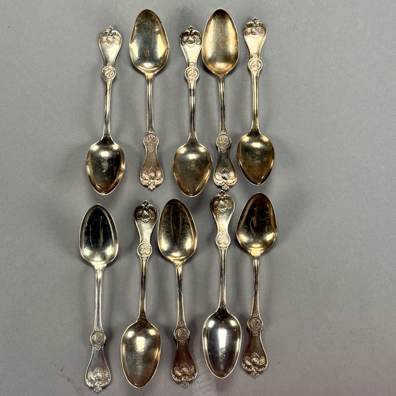 Home / ANTIQUE ESTATE AUCTION - FRI FEBRUARY 20 AT 6 PM / LOT 120 TEN COIN SILVER TEASPOONS DECORATED WITH STRAWBERRIES, PALMER, BACHELDERS & CO. 5-3/4″(L), 6 OZT LOT 120 TEN COIN SILVER TEASPOONS DECORATED WITH STRAWBERRIES, PALMER, BACHELDERS & CO. 5-3/4″(L), 6 OZT Place a Bid Category: ANTIQUE ESTATE AUCTION - FRI FEBRUARY 20 AT 6 PM Tag: auction Related products LOT 022 STEPHEN G. MANIATTY, ‘BUCKET OF POSIES’, OIL ON CANVAS, SIGNED LOWER RIGHT, FRAMED. 38 X 36 LOT 024 STEPHEN G. MANIATTY, ‘OCTOBERS GIFT’, OIL ON CANVAS, SIGNED LOWER RIGHT, FRAMED. 34 X 25 LOT 014 PAIR OF STERLING SILVER 2 HANDLED PLATES BY WEBSTER MARKED ‘6613’, NO MONOGRAM, 10-1/2 AT WIDEST, 21.3 OZT LOT 006 FINE PAIR OF FANCY STERLING SILVER CANDLESTICKS, SHEFFIELD, 1903-4 WITH MAKER’S MARK ‘HE LD’, 12″(H)