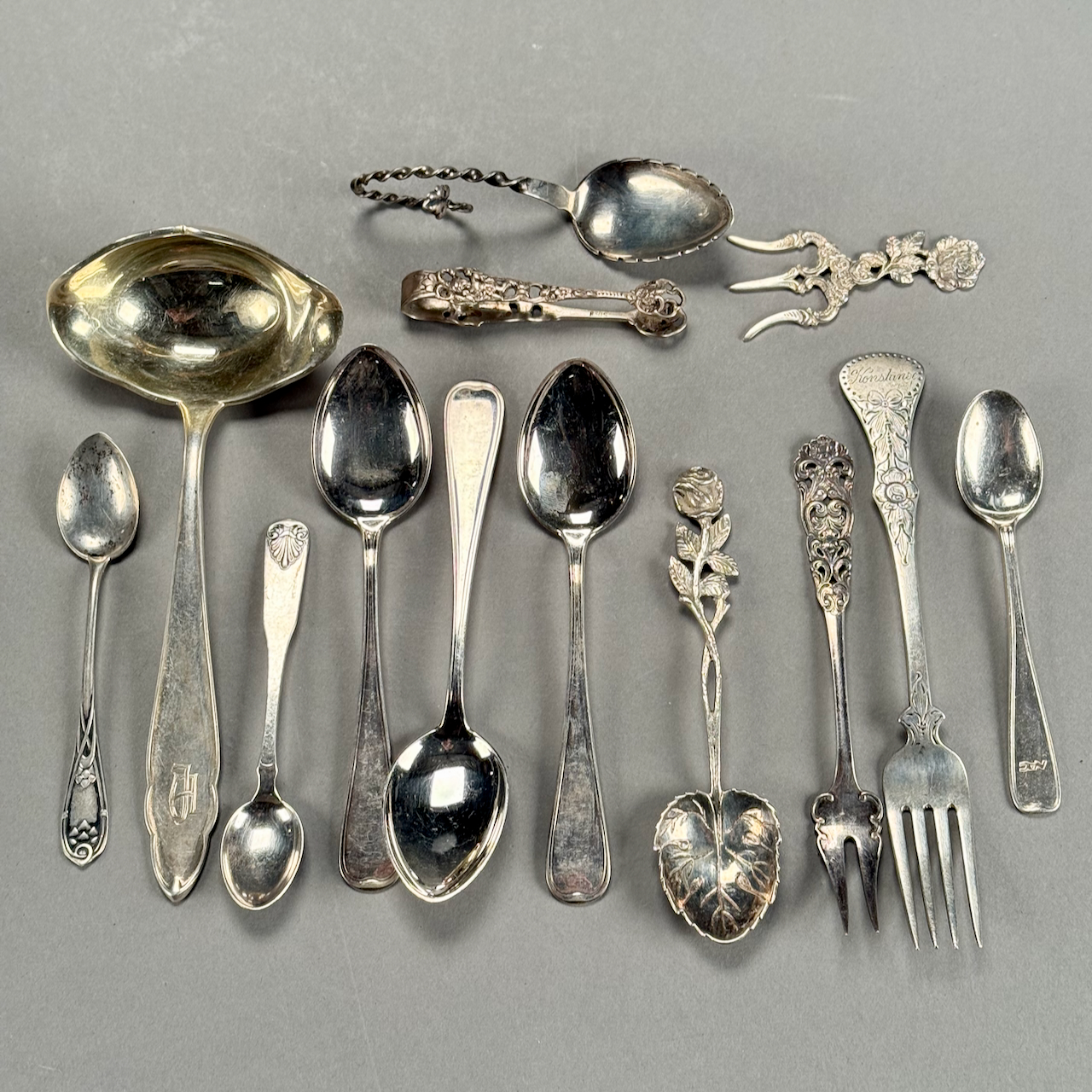 Home / ANTIQUE ESTATE AUCTION - FRI FEBRUARY 20 AT 6 PM / LOT 124 THIRTEEN PCS OF CONTINENTAL SILVER MARKED .800 OR .830, 10 OZT LOT 124 THIRTEEN PCS OF CONTINENTAL SILVER MARKED .800 OR .830, 10 OZT Place a Bid Category: ANTIQUE ESTATE AUCTION - FRI FEBRUARY 20 AT 6 PM Tag: auction Related products LOT 016 6 PCS OF STERLING SILVER: (1) 6″(D) PLATE BY TOWLE. (2) 3-1/2 FOOTED CREAMER BY POOLE. (3) 4″(D) FOOTED BOWL BY SHREVE, CRUMP & LOW CO (4) 7″(L) FOOTED GRAVY BY J.E. CALDWELL & CO (5) 4″ CREAMER BY DOMINICK & HAFF (6) 6-3/4″(W) DISH BY TOWLE. 25.2 OZT LOT 020 STERLING SILVER HINGED SQUARE BOX, LONDON, 1806, MAKERS MARK RH?, THE LID WITH A REPOUSSE SCENE OF 2 MEN PLAYING A BOARD GAME. 1-1/4″(H), 4″(W), 4″(D) LOT 006 FINE PAIR OF FANCY STERLING SILVER CANDLESTICKS, SHEFFIELD, 1903-4 WITH MAKER’S MARK ‘HE LD’, 12″(H) LOT 023 STEPHEN G. MANIATTY, ‘SAWMILL’, OIL ON CANVAS, SIGNED LOWER RIGHT, FRAMED WITH AN AWARD PLAQUE “GRUMBACHER ARTISTS MATERIAL AWARD/GRAND NATIONAL EXHIBITION/NEW YORK CITY – 1965”. 20 X 30