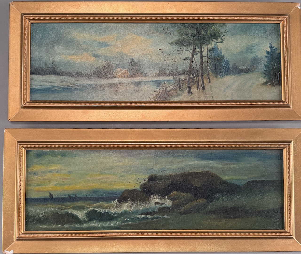 Home / ANTIQUE ESTATE AUCTION - FRI MARCH 27 AT 6 PM / LOT 125 UNSIGNED, PAIR OF WORKS, WINTER LANDSCAPE AND COASTAL SCENE, FRAMED. 6-1/4 X 18 LOT 125 UNSIGNED, PAIR OF WORKS, WINTER LANDSCAPE AND COASTAL SCENE, FRAMED. 6-1/4 X 18 Place a Bid Category: ANTIQUE ESTATE AUCTION - FRI MARCH 27 AT 6 PM Tag: auction Related products LOT 010 2 STERLING SILVER SHAKERS, ONE 6″(H) WITH BLURRED ENGLISH HALLMARKS, THE OTHER 6-1/2″(H) MARKED STERLING. 9 OZT LOT 002 3 PC STERLING SILVER TEA SET BY GORHAM CONSISTING OF 10″ TEAPOT (2441), 6-1/2″ CREAMER (2444), 6″ COVERED SUGAR (2443), 45 OZT LOT 004 133 PC STERLING SILVER FLATWARE SET IN THE “KING PATTERN. 190 OZT (EXCLUDING 12 KNIVES), MONOGRAMMED LOT 013 3 PCS OF STERLING SILVER: (1) OVAL DEEP SERVING DISH BY E. CALDWELL & CO, 10 X 6-1/2. (2) PORRINGER BY DOMINICK & HAFF, 7″. (3) PORRINGER BY RWM, 6″. 21.8 OZT