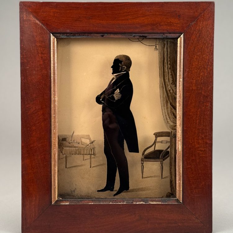 Home / OCTOBER 3 AT 6 PM / LOT 126 UNSIGNED (ENGLISH SCHOOL, 19TH C.), SILHOUETTE PORTRAIT OF A GENTLEMAN WITH DESK IN BACKGROUND, REVERSE-PAINTING ON GLASS, FRAMED, 12 X 9 SIGHT SIZE. PROV. CHARLES P. RUSSELL ART COLLECTION. LABEL ON REVERSE. LOT 126 UNSIGNED (ENGLISH SCHOOL, 19TH C.), SILHOUETTE PORTRAIT OF A GENTLEMAN WITH DESK IN BACKGROUND, REVERSE-PAINTING ON GLASS, FRAMED, 12 X 9 SIGHT SIZE. PROV. CHARLES P. RUSSELL ART COLLECTION. LABEL ON REVERSE. Place a Bid Categories: ANTIQUE AUCTION - FRI OCTOBER 3 AT 6 PM, OCTOBER 3 AT 6 PM Tag: auction Related products LOT 006 FINE PAIR OF FANCY STERLING SILVER CANDLESTICKS, SHEFFIELD, 1903-4 WITH MAKER’S MARK ‘HE LD’, 12″(H) LOT 009 48 PC STERLING SILVER FLATWARE SET IN THE “KING GEORGE” PATTERN BY GORHAM, 57 OZT (WITHOUT 16 KNIVES) MONOGRAMMED LOT 012 2 SMALL STERLING SILVER TRAYS. (1) 6″ SQUARE BY DOMINICK & HAFF (2) 7-1/2 X 5-1/2 OVAL FOOTED TRAY BY J.E. CALDWELL & CO, BOTH MONOGRAMMED. 11.7 OZT LOT 014 PAIR OF STERLING SILVER 2 HANDLED PLATES BY WEBSTER MARKED ‘6613’, NO MONOGRAM, 10-1/2 AT WIDEST, 21.3 OZT