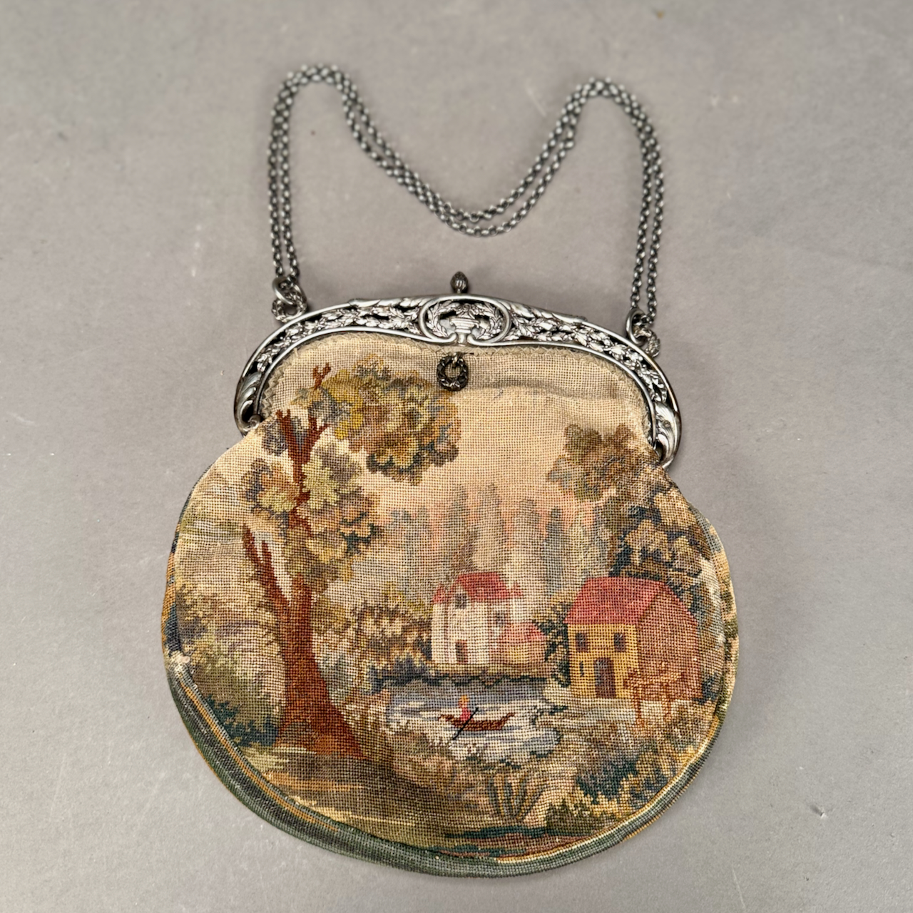 Home / ANTIQUE ESTATE AUCTION - FRI DECEMBER 12 AT 6 PM / LOT 130 FINE NEEDLEPOINT PURSE WITH SILVER PLATED FRAME AND PUSH BUTTON CLASP. 8-1/2″ X 8″ LOT 130 FINE NEEDLEPOINT PURSE WITH SILVER PLATED FRAME AND PUSH BUTTON CLASP. 8-1/2″ X 8″ Place a Bid Category: ANTIQUE ESTATE AUCTION - FRI DECEMBER 12 AT 6 PM Tag: auction Related products LOT 001 PAIR OF STERLING SILVER COLUMN CANDLESTICKS BY GORHAM MARKED A3207 EACH HAVING REMOVABLE BOBECHES. 10-1/4″(H) LOT 023 STEPHEN G. MANIATTY, ‘SAWMILL’, OIL ON CANVAS, SIGNED LOWER RIGHT, FRAMED WITH AN AWARD PLAQUE “GRUMBACHER ARTISTS MATERIAL AWARD/GRAND NATIONAL EXHIBITION/NEW YORK CITY – 1965”. 20 X 30 LOT 021 OSCAR BERNINGHAUS, ‘THE ROAD TO TAOS’, OIL ON CANVAS, SIGNED LOWER RIGHT, GILT FRAME WITH ARTIST PLAQUE. ON REVERSE OF FRAME IS A PENNSYLVANIA ACADEMY OF THE FINE ART LABEL FOR THEIR 109TH ANNUAL ART EXHIBITION WITH TITLE AND ARTIST (1914). 24 X 36 LOT 010 2 STERLING SILVER SHAKERS, ONE 6″(H) WITH BLURRED ENGLISH HALLMARKS, THE OTHER 6-1/2″(H) MARKED STERLING. 9 OZT