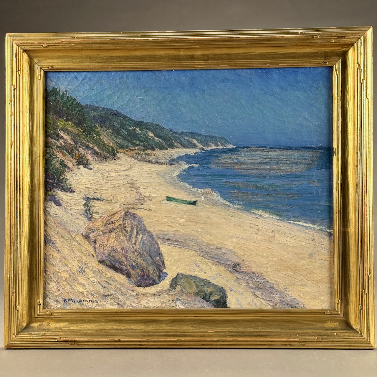 Home / ANTIQUE ESTATE AUCTION - FRI JANUARY 30 AT 6 PM / LOT 132 ROBERT F. WILLIAMS, GREEN DORY ON A SANDY SHORELINE, OIL ON CANVAS, SIGNED LOWER LEFT, HOUSED IN A SIGNED PERIOD NEWCOMB-MACKLIN CO. FRAME, WHICH HAS A PARTIAL EXHIBITION LABEL TO REVERSE. 20 X 24 LOT 132 ROBERT F. WILLIAMS, GREEN DORY ON A SANDY SHORELINE, OIL ON CANVAS, SIGNED LOWER LEFT, HOUSED IN A SIGNED PERIOD NEWCOMB-MACKLIN CO. FRAME, WHICH HAS A PARTIAL EXHIBITION LABEL TO REVERSE. 20 X 24 Place a Bid Category: ANTIQUE ESTATE AUCTION - FRI JANUARY 30 AT 6 PM Tag: auction Related products LOT 003 PAIR OF STERLING SILVER PORRINGERS BY GEBELEIN, BOSTON. 7″(L), 4-3/4 BOWL, 12 OZT LOT 011 4 PCS OF ENGLISH STERLING SILVER. (1) EXPANDING TOAST RACK, 1901-1902, LONDON, 3″(H). (2) 3″ TEA CADDY SPOON, 1796-7, LONDON. (3) 7″ RETICULATED 2 HANDLED DISH, 1906-7, BIRMINGHAM. (4) 2″(H) TANKARD SHAPED MUSTARD WITH COBALT LINER, 1902-3, BIRMINGHAM. 12.6 OZT (W/O LINER) LOT 002 3 PC STERLING SILVER TEA SET BY GORHAM CONSISTING OF 10″ TEAPOT (2441), 6-1/2″ CREAMER (2444), 6″ COVERED SUGAR (2443), 45 OZT LOT 021 OSCAR BERNINGHAUS, ‘THE ROAD TO TAOS’, OIL ON CANVAS, SIGNED LOWER RIGHT, GILT FRAME WITH ARTIST PLAQUE. ON REVERSE OF FRAME IS A PENNSYLVANIA ACADEMY OF THE FINE ART LABEL FOR THEIR 109TH ANNUAL ART EXHIBITION WITH TITLE AND ARTIST (1914). 24 X 36