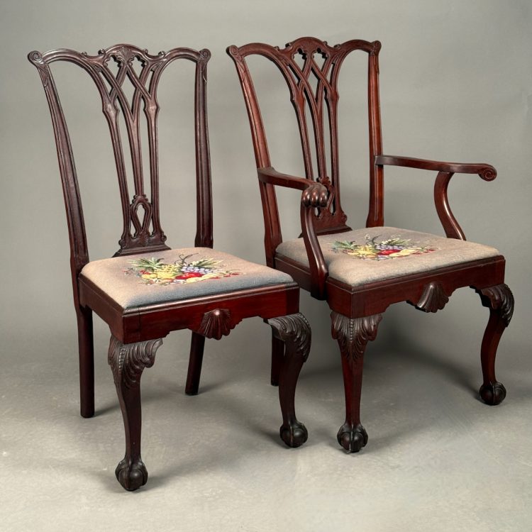 Home / ANTIQUE AUCTION - FRI OCTOBER 3 AT 6 PM / LOT 144 SET OF 10 MAHOGANY BALL & CLAW FOOT CHIPPENDALE STYLE CHAIRS, NEEDLEPOINT SEATS, 9 SIDE AND 1 ARM. 40-1/2″(H) PROV. PURPORTEDLY FROM THE JOHN ROCKEFELLER HOME, MANSION ON EUCLID AVENUE IN CLEVELAND, OH LOT 144 SET OF 10 MAHOGANY BALL & CLAW FOOT CHIPPENDALE STYLE CHAIRS, NEEDLEPOINT SEATS, 9 SIDE AND 1 ARM. 40-1/2″(H) PROV. PURPORTEDLY FROM THE JOHN ROCKEFELLER HOME, MANSION ON EUCLID AVENUE IN CLEVELAND, OH Place a Bid Categories: ANTIQUE AUCTION - FRI OCTOBER 3 AT 6 PM, OCTOBER 3 AT 6 PM Tag: auction Related products LOT 024 STEPHEN G. MANIATTY, ‘OCTOBERS GIFT’, OIL ON CANVAS, SIGNED LOWER RIGHT, FRAMED. 34 X 25 LOT 014 PAIR OF STERLING SILVER 2 HANDLED PLATES BY WEBSTER MARKED ‘6613’, NO MONOGRAM, 10-1/2 AT WIDEST, 21.3 OZT LOT 001 PAIR OF STERLING SILVER COLUMN CANDLESTICKS BY GORHAM MARKED A3207 EACH HAVING REMOVABLE BOBECHES. 10-1/4″(H) LOT 023 STEPHEN G. MANIATTY, ‘SAWMILL’, OIL ON CANVAS, SIGNED LOWER RIGHT, FRAMED WITH AN AWARD PLAQUE “GRUMBACHER ARTISTS MATERIAL AWARD/GRAND NATIONAL EXHIBITION/NEW YORK CITY – 1965”. 20 X 30