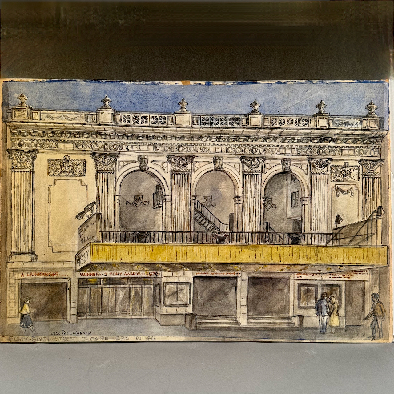 Home / ESTATE COLLECTION OF AMERICAN ARTIST JACK PAUL MAROON DECEMBER 19 AT 6PM / LOT 152 “FORTY-SIXTH STREET THEATRE – 226 W 46”, WATERCOLOR, SIGNED, UNFRAMED. 15 X 22 LOT 152 “FORTY-SIXTH STREET THEATRE – 226 W 46”, WATERCOLOR, SIGNED, UNFRAMED. 15 X 22 Place a Bid Category: ESTATE COLLECTION OF AMERICAN ARTIST JACK PAUL MAROON DECEMBER 19 AT 6PM Tag: auction Related products LOT 023 STEPHEN G. MANIATTY, ‘SAWMILL’, OIL ON CANVAS, SIGNED LOWER RIGHT, FRAMED WITH AN AWARD PLAQUE “GRUMBACHER ARTISTS MATERIAL AWARD/GRAND NATIONAL EXHIBITION/NEW YORK CITY – 1965”. 20 X 30 LOT 020 STERLING SILVER HINGED SQUARE BOX, LONDON, 1806, MAKERS MARK RH?, THE LID WITH A REPOUSSE SCENE OF 2 MEN PLAYING A BOARD GAME. 1-1/4″(H), 4″(W), 4″(D) LOT 012 2 SMALL STERLING SILVER TRAYS. (1) 6″ SQUARE BY DOMINICK & HAFF (2) 7-1/2 X 5-1/2 OVAL FOOTED TRAY BY J.E. CALDWELL & CO, BOTH MONOGRAMMED. 11.7 OZT LOT 014 PAIR OF STERLING SILVER 2 HANDLED PLATES BY WEBSTER MARKED ‘6613’, NO MONOGRAM, 10-1/2 AT WIDEST, 21.3 OZT