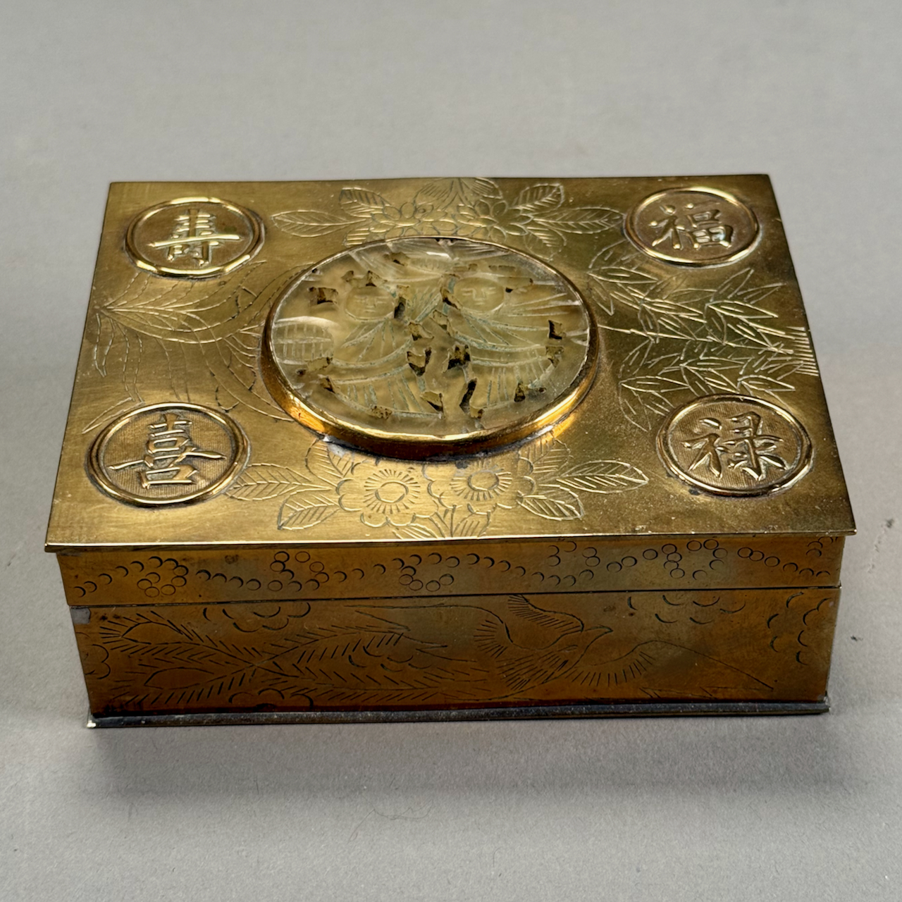 Home / ANTIQUE ESTATE AUCTION - FRI MARCH 27 AT 6 PM / LOT 159 CHINESE BRASS HINGED TOP BOX WITH INSET CARVED JADE PLAQUE. 1-1/2″(H), 4-1/2″(W), 3-3/4″(D) LOT 159 CHINESE BRASS HINGED TOP BOX WITH INSET CARVED JADE PLAQUE. 1-1/2″(H), 4-1/2″(W), 3-3/4″(D) Place a Bid Category: ANTIQUE ESTATE AUCTION - FRI MARCH 27 AT 6 PM Tag: auction Related products LOT 020 STERLING SILVER HINGED SQUARE BOX, LONDON, 1806, MAKERS MARK RH?, THE LID WITH A REPOUSSE SCENE OF 2 MEN PLAYING A BOARD GAME. 1-1/4″(H), 4″(W), 4″(D) LOT 023 STEPHEN G. MANIATTY, ‘SAWMILL’, OIL ON CANVAS, SIGNED LOWER RIGHT, FRAMED WITH AN AWARD PLAQUE “GRUMBACHER ARTISTS MATERIAL AWARD/GRAND NATIONAL EXHIBITION/NEW YORK CITY – 1965”. 20 X 30 LOT 019 COIN SILVER MUG BY C. BARD & SON, PHILADELPHIA, PA, CIRCA 1850 INSCRIBED ‘ANNA CRAIG FULTON’, THE BODY HAVING REPOUSSE FLOWERS. 3-1/2″(H), 3.3 OZT LOT 002 3 PC STERLING SILVER TEA SET BY GORHAM CONSISTING OF 10″ TEAPOT (2441), 6-1/2″ CREAMER (2444), 6″ COVERED SUGAR (2443), 45 OZT