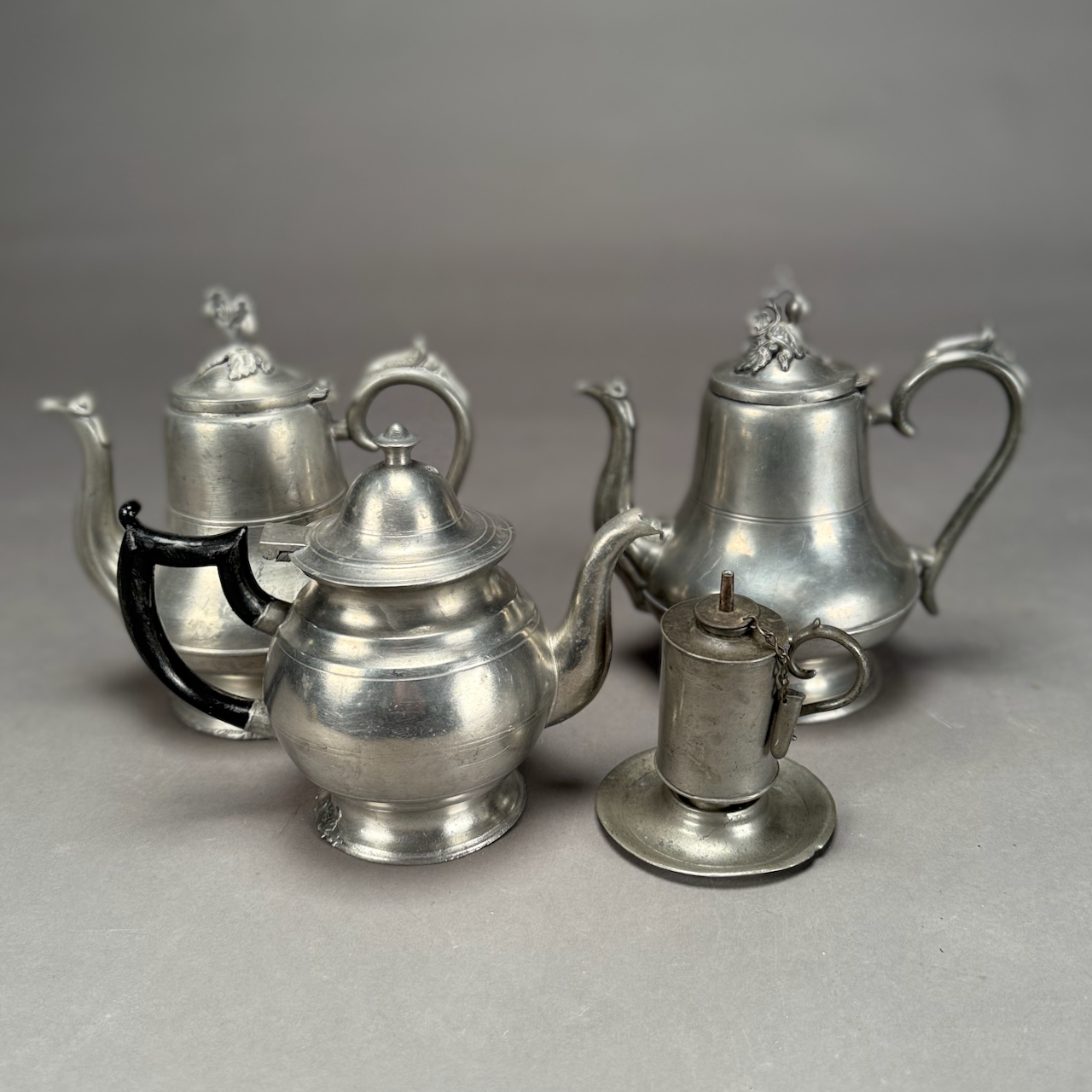 Home / ANTIQUE ESTATE AUCTION - FRI DECEMBER 12 AT 6 PM / LOT 159 THREE ANTIQUE PEWTER TEAPOTS BY THE PORTERS OF MAINE, 7 – 8-1/2″(H) ALONG WITH A 4-1/2″(H) UNSIGNED PEWTER WHALE OIL CHAMBERSTICK LOT 159 THREE ANTIQUE PEWTER TEAPOTS BY THE PORTERS OF MAINE, 7 – 8-1/2″(H) ALONG WITH A 4-1/2″(H) UNSIGNED PEWTER WHALE OIL CHAMBERSTICK Place a Bid Category: ANTIQUE ESTATE AUCTION - FRI DECEMBER 12 AT 6 PM Tag: auction Related products LOT 011 4 PCS OF ENGLISH STERLING SILVER. (1) EXPANDING TOAST RACK, 1901-1902, LONDON, 3″(H). (2) 3″ TEA CADDY SPOON, 1796-7, LONDON. (3) 7″ RETICULATED 2 HANDLED DISH, 1906-7, BIRMINGHAM. (4) 2″(H) TANKARD SHAPED MUSTARD WITH COBALT LINER, 1902-3, BIRMINGHAM. 12.6 OZT (W/O LINER) LOT 021 OSCAR BERNINGHAUS, ‘THE ROAD TO TAOS’, OIL ON CANVAS, SIGNED LOWER RIGHT, GILT FRAME WITH ARTIST PLAQUE. ON REVERSE OF FRAME IS A PENNSYLVANIA ACADEMY OF THE FINE ART LABEL FOR THEIR 109TH ANNUAL ART EXHIBITION WITH TITLE AND ARTIST (1914). 24 X 36 LOT 006 FINE PAIR OF FANCY STERLING SILVER CANDLESTICKS, SHEFFIELD, 1903-4 WITH MAKER’S MARK ‘HE LD’, 12″(H) LOT 009 48 PC STERLING SILVER FLATWARE SET IN THE “KING GEORGE” PATTERN BY GORHAM, 57 OZT (WITHOUT 16 KNIVES) MONOGRAMMED