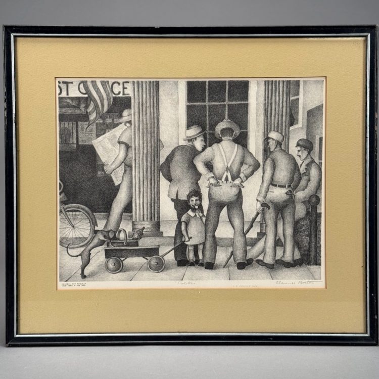 Home / ANTIQUE AUCTION - FRI OCTOBER 3 AT 6 PM / LOT 163 CLARENCE BOLTON, “POLITICS”, LITHOGRAPH, PENCIL SIGNED LOWER RIGHT, FRAMED. 10 X 12-1/2 SIGHT SIZE LOT 163 CLARENCE BOLTON, “POLITICS”, LITHOGRAPH, PENCIL SIGNED LOWER RIGHT, FRAMED. 10 X 12-1/2 SIGHT SIZE Place a Bid Categories: ANTIQUE AUCTION - FRI OCTOBER 3 AT 6 PM, OCTOBER 3 AT 6 PM Tag: auction Related products LOT 019 COIN SILVER MUG BY C. BARD & SON, PHILADELPHIA, PA, CIRCA 1850 INSCRIBED ‘ANNA CRAIG FULTON’, THE BODY HAVING REPOUSSE FLOWERS. 3-1/2″(H), 3.3 OZT LOT 017 CONTINENTAL SILVER (.800) DRESSER BOX MARKED ON BASE ‘BEUTHNER’. 3-1/4″(H), 5-1/2″(W) X 4″(D), 8 OZT LOT 016 6 PCS OF STERLING SILVER: (1) 6″(D) PLATE BY TOWLE. (2) 3-1/2 FOOTED CREAMER BY POOLE. (3) 4″(D) FOOTED BOWL BY SHREVE, CRUMP & LOW CO (4) 7″(L) FOOTED GRAVY BY J.E. CALDWELL & CO (5) 4″ CREAMER BY DOMINICK & HAFF (6) 6-3/4″(W) DISH BY TOWLE. 25.2 OZT LOT 023 STEPHEN G. MANIATTY, ‘SAWMILL’, OIL ON CANVAS, SIGNED LOWER RIGHT, FRAMED WITH AN AWARD PLAQUE “GRUMBACHER ARTISTS MATERIAL AWARD/GRAND NATIONAL EXHIBITION/NEW YORK CITY – 1965”. 20 X 30