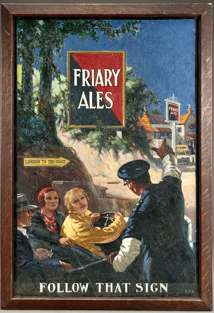 Home / ANTIQUE ESTATE AUCTION - FRI MARCH 27 AT 6 PM / LOT 178 FRAMED ORIGINAL ADVERTISING PAINTING FOR “FRIARY ALES”, WITH SLOGAN “FOLLOW THAT SIGN”, SIGNED LOWER RIGHT “E.P.K”, OIL ON CANVAS, 30 X 20 LOT 178 FRAMED ORIGINAL ADVERTISING PAINTING FOR “FRIARY ALES”, WITH SLOGAN “FOLLOW THAT SIGN”, SIGNED LOWER RIGHT “E.P.K”, OIL ON CANVAS, 30 X 20 Place a Bid Category: ANTIQUE ESTATE AUCTION - FRI MARCH 27 AT 6 PM Tag: auction Related products LOT 007 FIXED HANDLED STERLING SILVER LOW BASKET MARKED BIGELOW, KENNARD & CO. 5-1/2″(H), 10-1/2″(D), 9.8 OZT LOT 001 PAIR OF STERLING SILVER COLUMN CANDLESTICKS BY GORHAM MARKED A3207 EACH HAVING REMOVABLE BOBECHES. 10-1/4″(H) LOT 020 STERLING SILVER HINGED SQUARE BOX, LONDON, 1806, MAKERS MARK RH?, THE LID WITH A REPOUSSE SCENE OF 2 MEN PLAYING A BOARD GAME. 1-1/4″(H), 4″(W), 4″(D) LOT 019 COIN SILVER MUG BY C. BARD & SON, PHILADELPHIA, PA, CIRCA 1850 INSCRIBED ‘ANNA CRAIG FULTON’, THE BODY HAVING REPOUSSE FLOWERS. 3-1/2″(H), 3.3 OZT