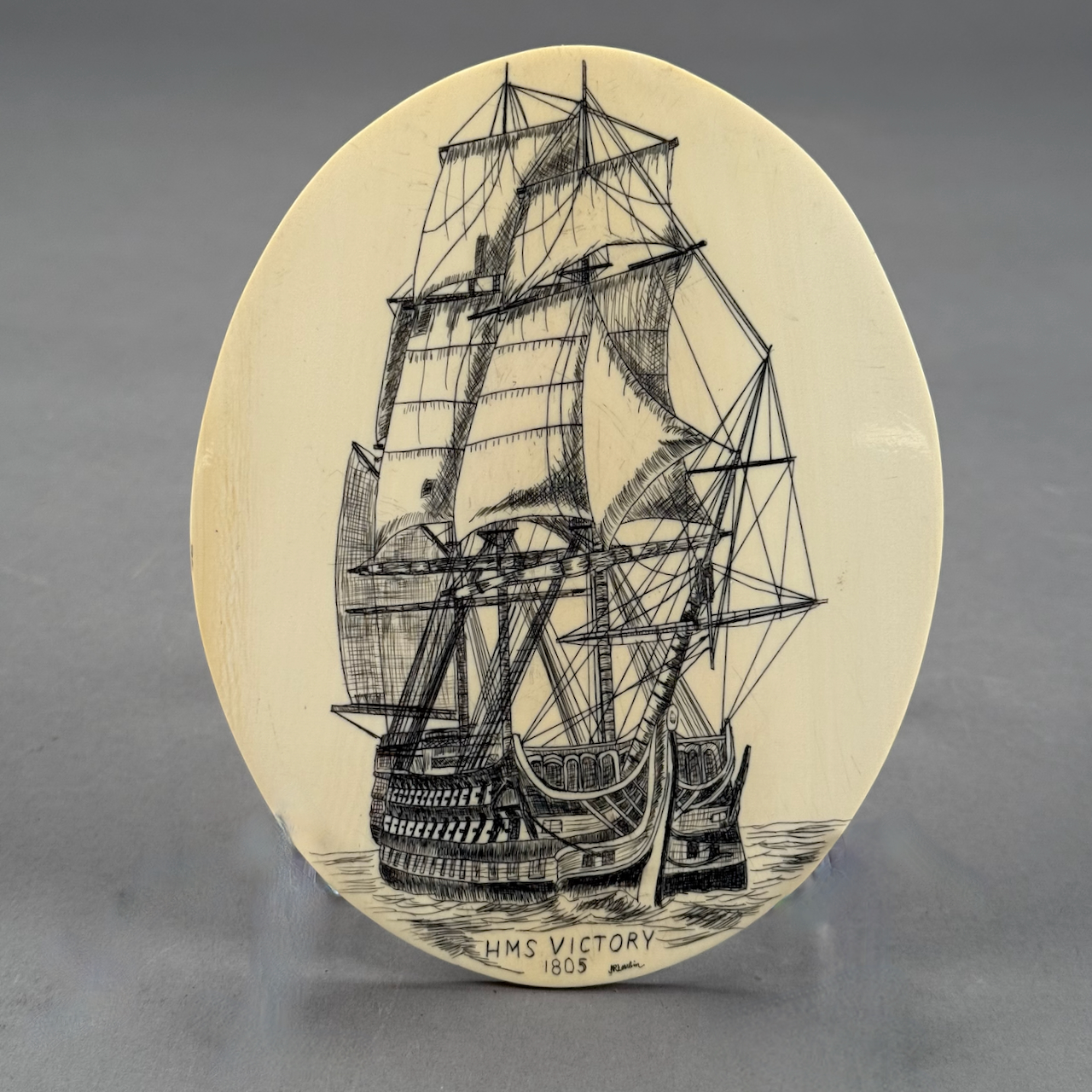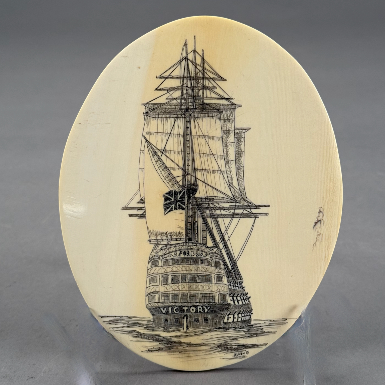 Home / ANTIQUE ESTATE AUCTION - FRI JANUARY 30 AT 6 PM / LOT 181 TWO SIDED OVAL SCRIMSHAW PLAQUE DEPICTING THE “HMS VICTORY 1805” SAILING TOWARD VIEWED ON ONE SIDE AND AWAY ON REVERSE, SIGNED “J.R. LAUBIN” (JONATHAN R. LAUBIN, VALLEJO, CA) 6″ X 5″ LOT 181 TWO SIDED OVAL SCRIMSHAW PLAQUE DEPICTING THE “HMS VICTORY 1805” SAILING TOWARD VIEWED ON ONE SIDE AND AWAY ON REVERSE, SIGNED “J.R. LAUBIN” (JONATHAN R. LAUBIN, VALLEJO, CA) 6″ X 5″ Place a Bid Category: ANTIQUE ESTATE AUCTION - FRI JANUARY 30 AT 6 PM Tag: auction Related products LOT 015 42 PC STERLING FLATWARE SET BY LUNT IN THE ‘WILLIAM & MARY’ PATTERN, NO MONOGRAM. 34.5 OZT (W/O 12 KNIVES) LOT 017 CONTINENTAL SILVER (.800) DRESSER BOX MARKED ON BASE ‘BEUTHNER’. 3-1/4″(H), 5-1/2″(W) X 4″(D), 8 OZT LOT 011 4 PCS OF ENGLISH STERLING SILVER. (1) EXPANDING TOAST RACK, 1901-1902, LONDON, 3″(H). (2) 3″ TEA CADDY SPOON, 1796-7, LONDON. (3) 7″ RETICULATED 2 HANDLED DISH, 1906-7, BIRMINGHAM. (4) 2″(H) TANKARD SHAPED MUSTARD WITH COBALT LINER, 1902-3, BIRMINGHAM. 12.6 OZT (W/O LINER) LOT 021 OSCAR BERNINGHAUS, ‘THE ROAD TO TAOS’, OIL ON CANVAS, SIGNED LOWER RIGHT, GILT FRAME WITH ARTIST PLAQUE. ON REVERSE OF FRAME IS A PENNSYLVANIA ACADEMY OF THE FINE ART LABEL FOR THEIR 109TH ANNUAL ART EXHIBITION WITH TITLE AND ARTIST (1914). 24 X 36