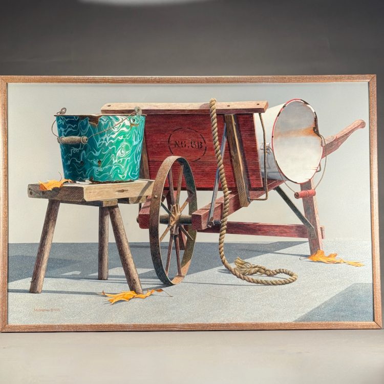 Home / ANTIQUE AUCTION - FRI OCTOBER 3 AT 6 PM / LOT 184 GENE MCINERNEY, WHEELBARROW WITH ENAMEL PAILS, OIL ON BOARD, SIGNED LOWER LEFT AND DATED 1990, FRAMED. 28 X 42. THIS ARTIST IS KNOWN FOR HIS HYPERREALISM LOT 184 GENE MCINERNEY, WHEELBARROW WITH ENAMEL PAILS, OIL ON BOARD, SIGNED LOWER LEFT AND DATED 1990, FRAMED. 28 X 42. THIS ARTIST IS KNOWN FOR HIS HYPERREALISM Place a Bid Categories: ANTIQUE AUCTION - FRI OCTOBER 3 AT 6 PM, OCTOBER 3 AT 6 PM Tag: auction Related products LOT 020 STERLING SILVER HINGED SQUARE BOX, LONDON, 1806, MAKERS MARK RH?, THE LID WITH A REPOUSSE SCENE OF 2 MEN PLAYING A BOARD GAME. 1-1/4″(H), 4″(W), 4″(D) LOT 011 4 PCS OF ENGLISH STERLING SILVER. (1) EXPANDING TOAST RACK, 1901-1902, LONDON, 3″(H). (2) 3″ TEA CADDY SPOON, 1796-7, LONDON. (3) 7″ RETICULATED 2 HANDLED DISH, 1906-7, BIRMINGHAM. (4) 2″(H) TANKARD SHAPED MUSTARD WITH COBALT LINER, 1902-3, BIRMINGHAM. 12.6 OZT (W/O LINER) LOT 024 STEPHEN G. MANIATTY, ‘OCTOBERS GIFT’, OIL ON CANVAS, SIGNED LOWER RIGHT, FRAMED. 34 X 25 LOT 018 COIN SILVER HANDLED CUP, PROBABLY FREEMAN & WALLIN, PHILADELPHIA, CIRCA 1850. 4″(H), 3.6 OZT.