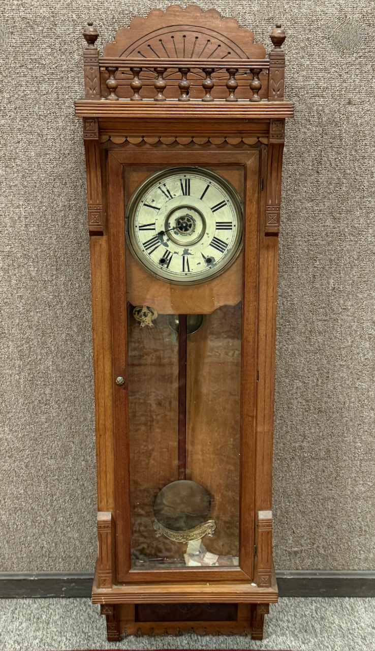Home / ANTIQUE ESTATE AUCTION - FRI MARCH 27 AT 6 PM / LOT 192 VICTORIAN WALL CLOCK WITH TIME, STRIKE & ALARM, PENDULUM PRESENT. 49″(H) LOT 192 VICTORIAN WALL CLOCK WITH TIME, STRIKE & ALARM, PENDULUM PRESENT. 49″(H) Place a Bid Category: ANTIQUE ESTATE AUCTION - FRI MARCH 27 AT 6 PM Tag: auction Related products LOT 021 OSCAR BERNINGHAUS, ‘THE ROAD TO TAOS’, OIL ON CANVAS, SIGNED LOWER RIGHT, GILT FRAME WITH ARTIST PLAQUE. ON REVERSE OF FRAME IS A PENNSYLVANIA ACADEMY OF THE FINE ART LABEL FOR THEIR 109TH ANNUAL ART EXHIBITION WITH TITLE AND ARTIST (1914). 24 X 36 LOT 011 4 PCS OF ENGLISH STERLING SILVER. (1) EXPANDING TOAST RACK, 1901-1902, LONDON, 3″(H). (2) 3″ TEA CADDY SPOON, 1796-7, LONDON. (3) 7″ RETICULATED 2 HANDLED DISH, 1906-7, BIRMINGHAM. (4) 2″(H) TANKARD SHAPED MUSTARD WITH COBALT LINER, 1902-3, BIRMINGHAM. 12.6 OZT (W/O LINER) LOT 007 FIXED HANDLED STERLING SILVER LOW BASKET MARKED BIGELOW, KENNARD & CO. 5-1/2″(H), 10-1/2″(D), 9.8 OZT LOT 010 2 STERLING SILVER SHAKERS, ONE 6″(H) WITH BLURRED ENGLISH HALLMARKS, THE OTHER 6-1/2″(H) MARKED STERLING. 9 OZT