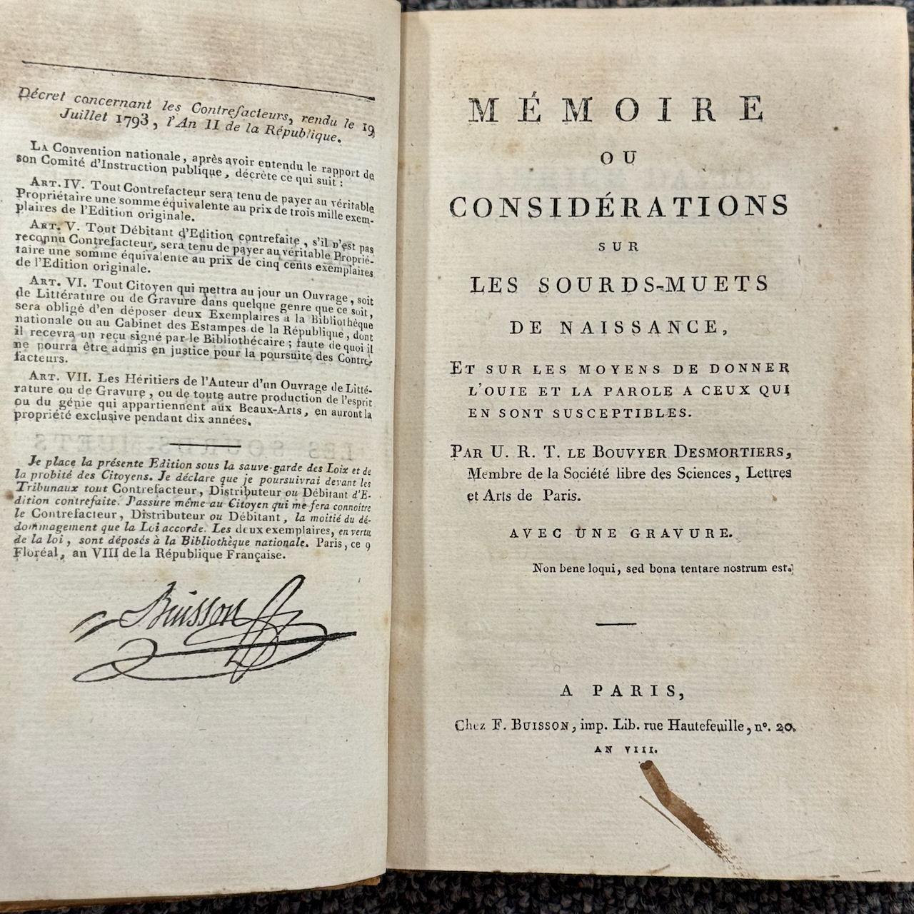 Home / ANTIQUE ESTATE AUCTION - FRI FEBRUARY 20 AT 6 PM / LOT 195 * U. R. T. Le Bouvier Desmortiers, MEMOIRE OU CONSIDERATIONS SUR LES SOURDS-MUETS DE NAISSANCE. (Paris, 1801). LOT 195 * U. R. T. Le Bouvier Desmortiers, MEMOIRE OU CONSIDERATIONS SUR LES SOURDS-MUETS DE NAISSANCE. (Paris, 1801). Place a Bid Category: ANTIQUE ESTATE AUCTION - FRI FEBRUARY 20 AT 6 PM Tag: auction Related products LOT 024 STEPHEN G. MANIATTY, ‘OCTOBERS GIFT’, OIL ON CANVAS, SIGNED LOWER RIGHT, FRAMED. 34 X 25 LOT 002 3 PC STERLING SILVER TEA SET BY GORHAM CONSISTING OF 10″ TEAPOT (2441), 6-1/2″ CREAMER (2444), 6″ COVERED SUGAR (2443), 45 OZT LOT 023 STEPHEN G. MANIATTY, ‘SAWMILL’, OIL ON CANVAS, SIGNED LOWER RIGHT, FRAMED WITH AN AWARD PLAQUE “GRUMBACHER ARTISTS MATERIAL AWARD/GRAND NATIONAL EXHIBITION/NEW YORK CITY – 1965”. 20 X 30 LOT 017 CONTINENTAL SILVER (.800) DRESSER BOX MARKED ON BASE ‘BEUTHNER’. 3-1/4″(H), 5-1/2″(W) X 4″(D), 8 OZT